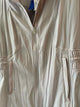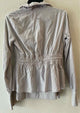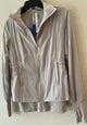 Long sleeve, light grey, windbreaker, zip up jacket, cinched back and back neck