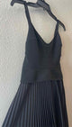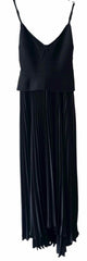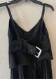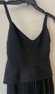 sleeveless,v neck,below knee,solid black,Gwen pleated asymmetrical dress,structured peplum bustier bodice with back zip closure,adjustable spaghetti strap,back belt,asymmetrical pleated skirt
