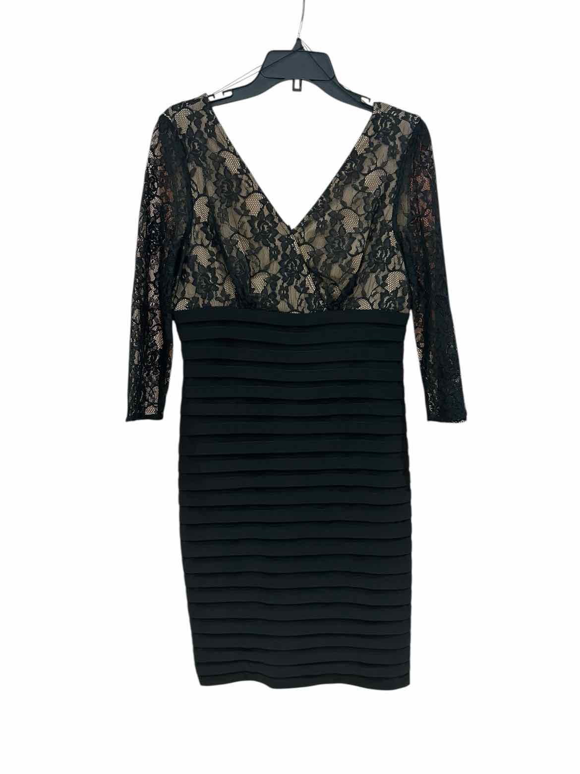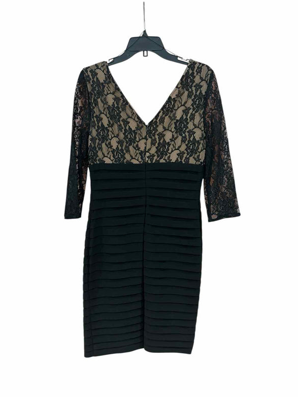 Featuring a striking silhouette, the Adrianna Papell Black Size 10 Dress brings together refined details and contemporary style for pre-loved designer fashion seekers. This authentic luxury resale piece blends a knee-length ruffled skirt with a V-neck crossover design, enhanced by 3/4 lace sleeves and a lace chest with a nude interior. The stretchy poly/nylon fabric ensures comfort, while a hidden back zipper offers a tailored fit. Curated for women’s consignment fashion, this chic dress in elegant black is a timeless addition to any wardrobe, combining Adrianna Papell’s signature attention to detail with the value of luxury resale.