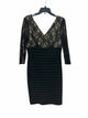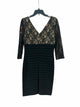 Knee length, 3/4 sleeve (lace), V-neck cross over design, lace chest with nude interior, ruffled tight skirt (all black), stretchy, hidden back zipper