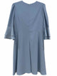 mini, 3/4 length trumpet sleeves, v-neck, satiny cuff, slight puff sleeve, gathering under bust, zipper/hook&eye closure