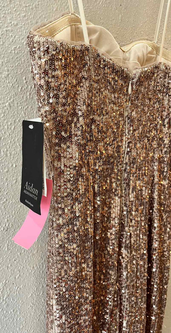 The rose gold shimmer of the Aidan Aidan Mattox Rose Gold Size 0 Dress brings a distinctively chic flair to authentic luxury resale and women's consignment fashion. This pre-loved designer piece, featuring a mini silhouette and asymmetrical flirty hem, is adorned with sequins for an eye-catching effect. The strapless neckline adds a polished touch, making it an exceptional choice for those who appreciate refined details. As a new-with-tags find, this dress offers both quality and elegance, curated for discerning shoppers seeking unique additions to their wardrobe.