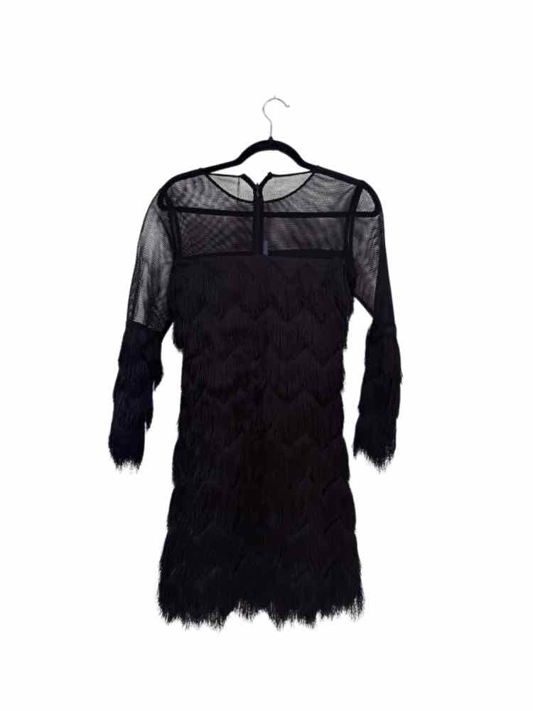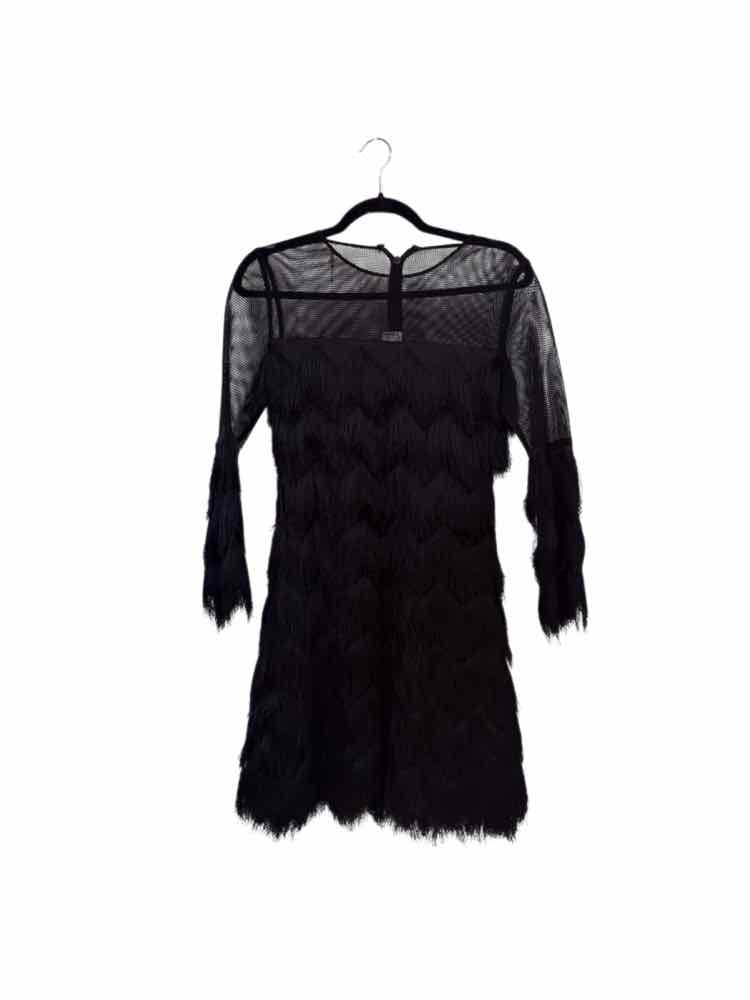 The distinctive black fringe throughout the Alexis Black Size S Dress brings dynamic movement and texture to your wardrobe, while mesh accents on the shoulders and sleeves add a modern, refined touch. This pre-loved designer piece, offered through authentic luxury resale, features a mini length and long sleeves for a chic silhouette. A small back zipper ensures a tailored fit, and the solid black color makes it a versatile addition to your collection of women's consignment fashion. Carefully curated in very good condition, this dress captures Alexis’ attention to detail and unique design elements.