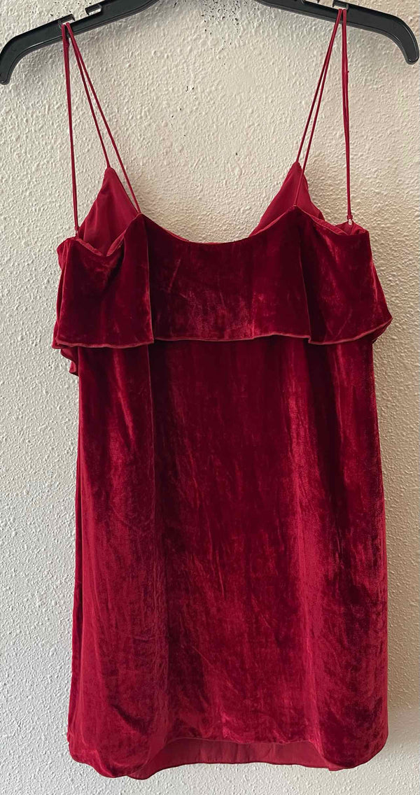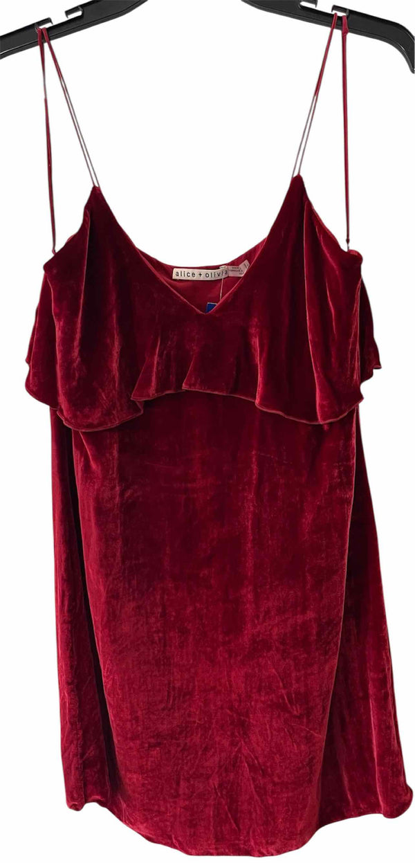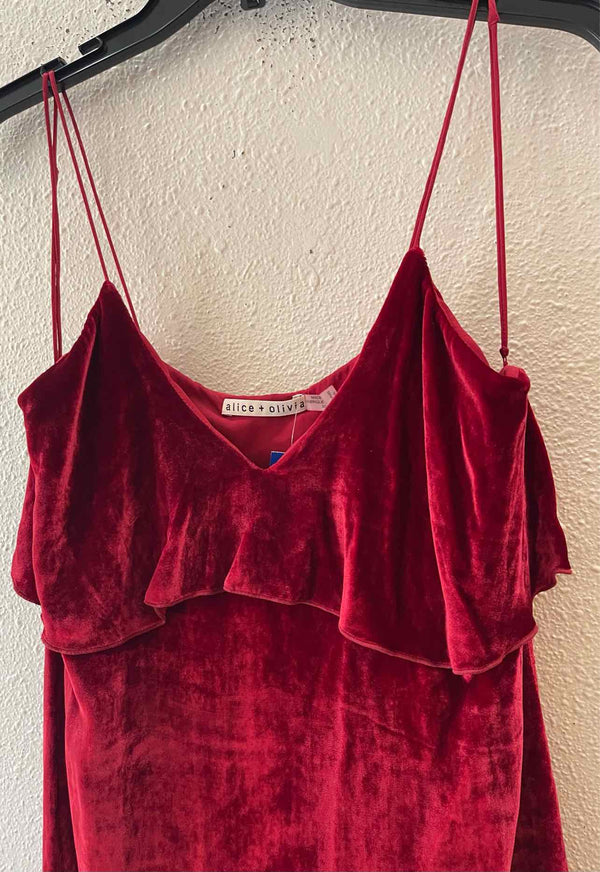 Crafted from luxurious silk velvet, this alice + olivia Wine Size XS Dress brings a touch of refined charm to any women's consignment fashion collection. The solid wine hue and sleeveless, v-neck silhouette create an elegant look, while the ruffle bust detail and slip dress design add a distinctive, feminine edge. Carefully lined for comfort and offered in very good condition, this authentic luxury resale piece presents the signature quality you expect from a pre-loved designer garment. Refresh your wardrobe with a dress that merges timeless style and elevated materials in every detail.