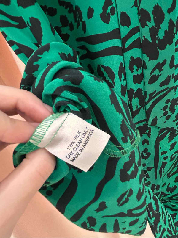The jade and black palette of the Amanda Uprichard Jade/Black Size P Dress brings a distinctive touch to any pre-loved designer wardrobe. This authentic luxury resale piece highlights a mini silhouette with 3/4 sleeves, a round collar, and an elegant notched deep v-neck, making it a unique find in women’s consignment fashion. Crafted from 100% silk, it exudes a refined, polished appeal while the cuffed sleeves add a tailored finish. Discover the blend of color and design that defines this chic dress, perfect for refreshing your style with a unique, gently owned Amanda Uprichard creation.