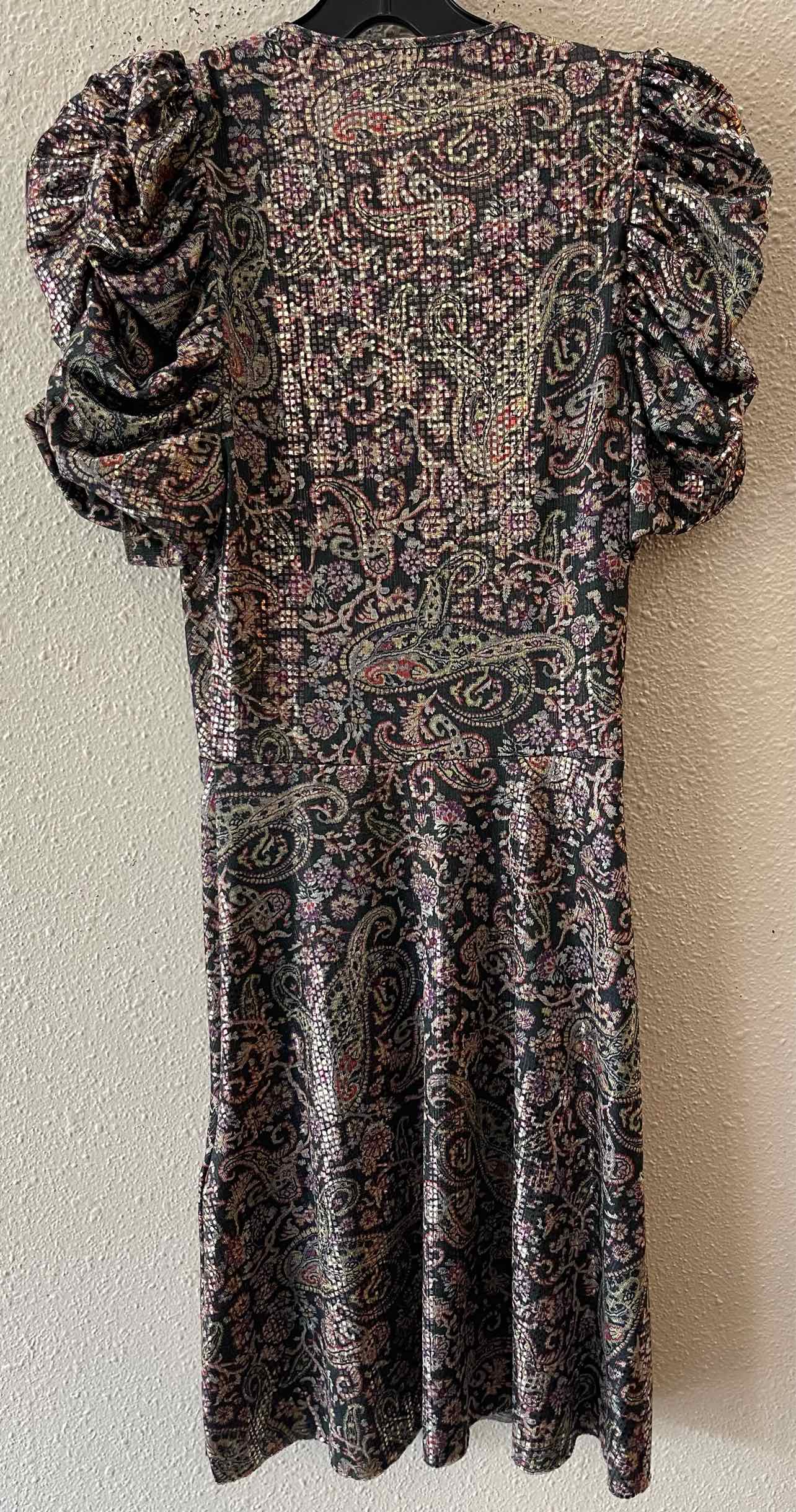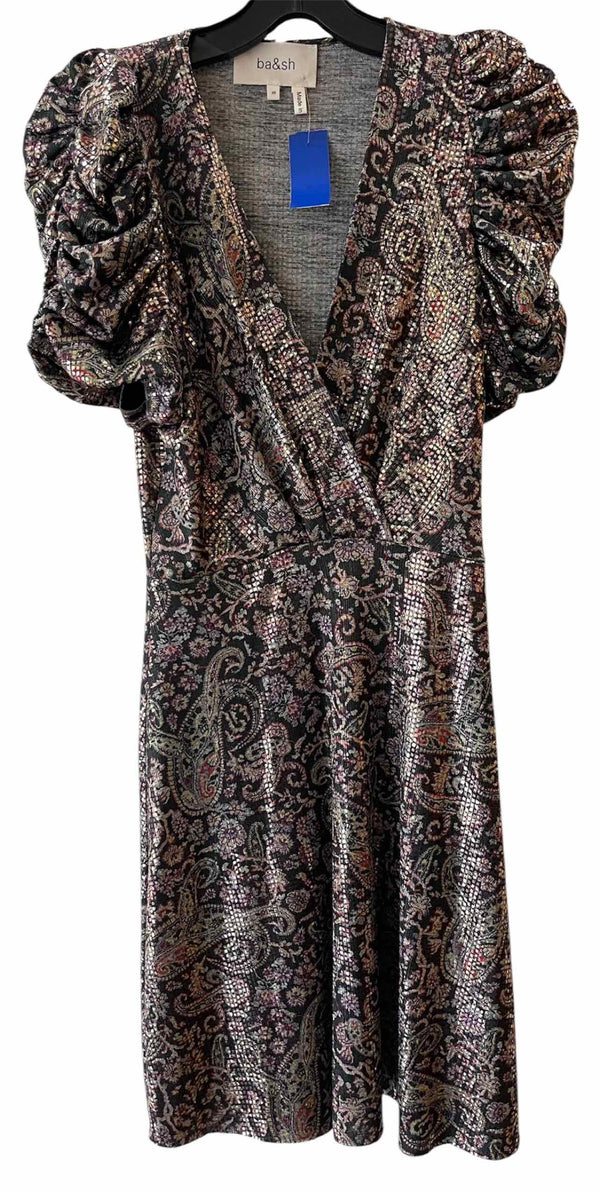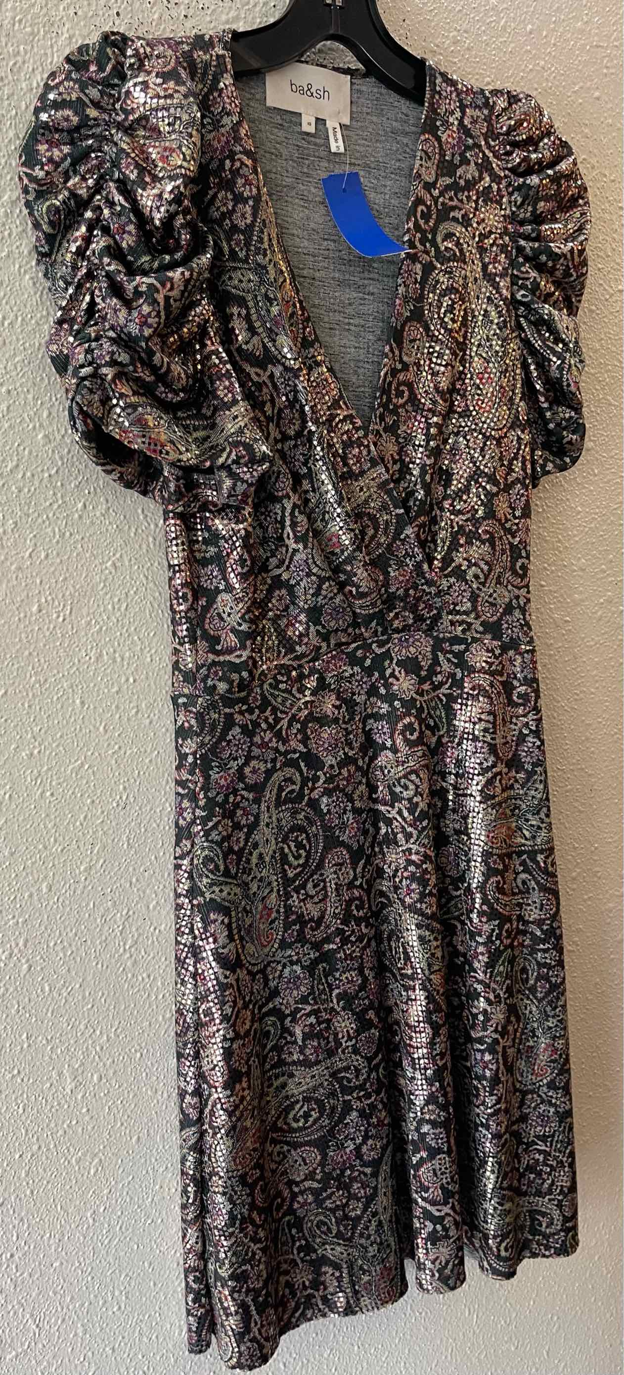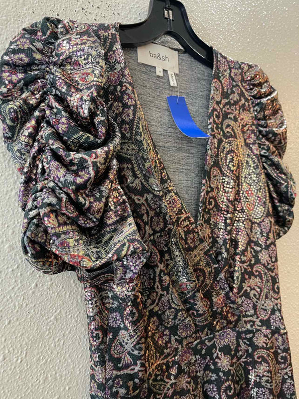 The Gala paisley print and metallic black multi hues of the Ba&sh Black Multi Size XS Dress bring a distinctive charm to authentic luxury resale. This pre-loved designer piece features a short sleeve, above-the-knee silhouette, and an elegant surplice neck. Elastic ruched puff sleeves add a chic touch, perfect for those seeking unique women's consignment fashion. Graded in very good condition, this dress allows you to refresh your wardrobe with a notable mix of pattern and shine, all while making a conscious choice for sustainable style.