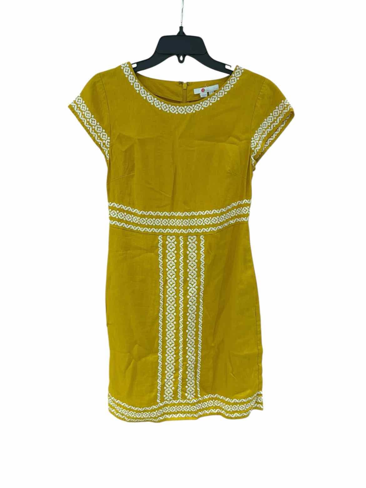 The vibrant yellow hue of the Boden Yellow Size 4 Dress instantly refreshes any wardrobe with its cheerful energy. This pre-loved designer piece, sourced from authentic luxury resale, features crisp white floral embroidery stripes that add a charming touch across the front and down the skirt. Crafted from polyester and tailored in a knee-length silhouette, this women’s consignment fashion find includes two practical pockets and a convenient back zipper closure. With short sleeves and a classic round neckline, this dress effortlessly combines comfort and distinctive style for any occasion.