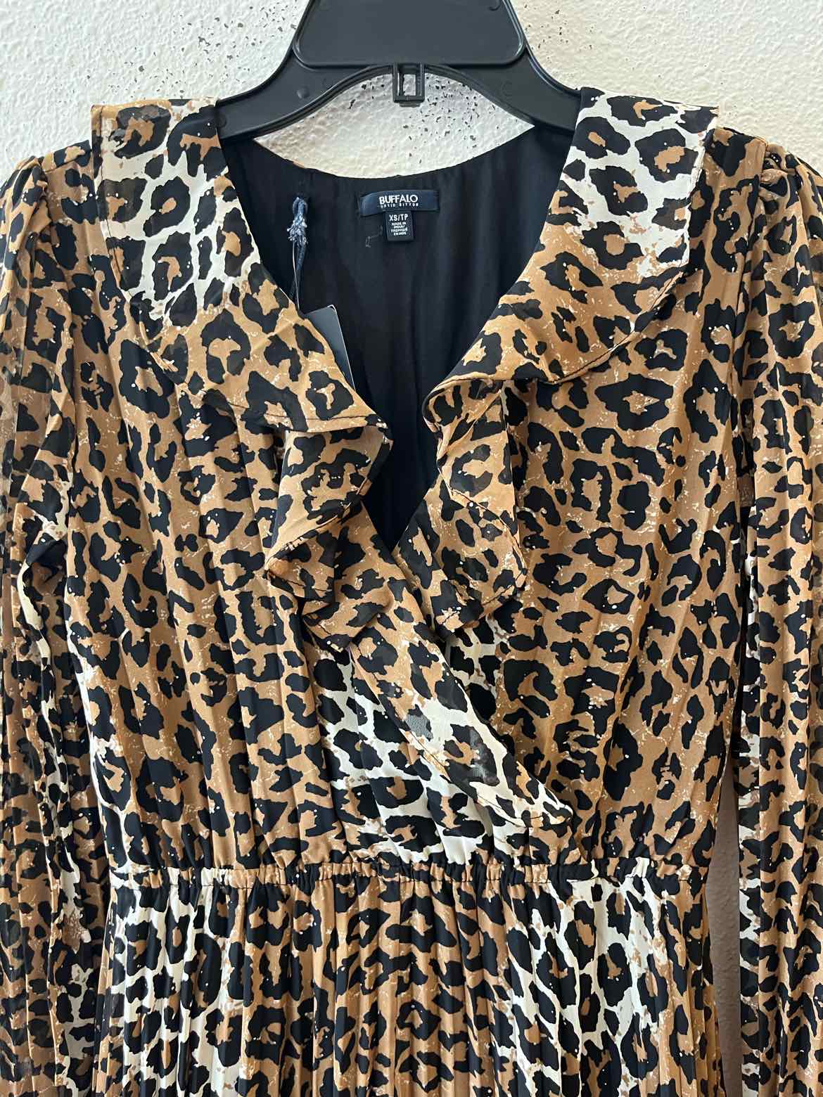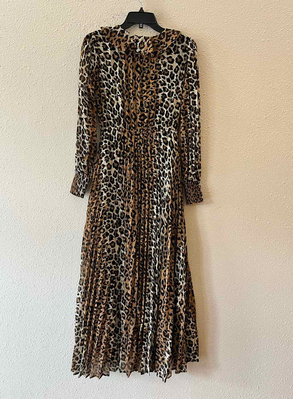 The leopard print of this Buffalo David Bitton leopard Size XS Dress brings a touch of bold charm to women's consignment fashion. Showcasing a distinctive brown, cream, and black palette, this authentic luxury resale find features an accordion pleated maxi silhouette, long sleeves, and a ruffle neckline. With its new-with-tags condition, this pre-loved designer piece offers both eye-catching style and refined detail, making it a unique addition to any wardrobe. Explore the carefully curated appeal of a dress that embodies both modern flair and timeless elegance.