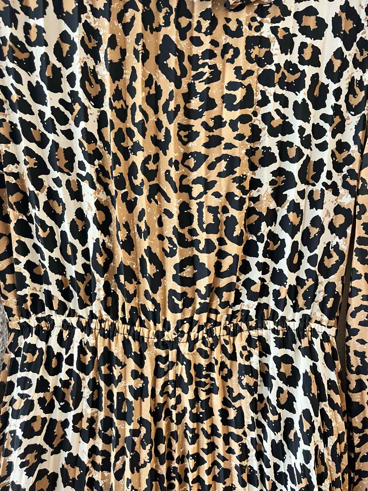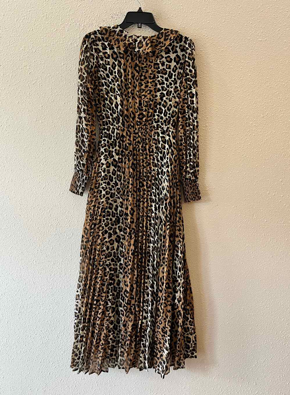 NWT Long sleeve, maxi, brown/cream/black leopard print, accordion pleated,ruffle neckline, dress