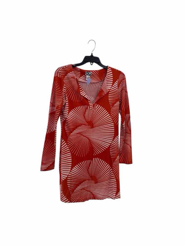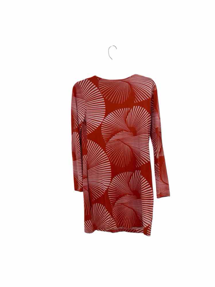 mini length, long sleeves, orange and white designs throughout, slight loose fit