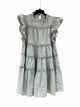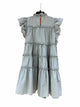 ruffle cap sleeve, mini, tiered seams, button back neck, flow fit
