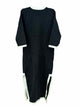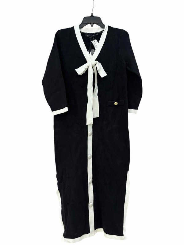 NWT, LS, black knit maxi dress, white trim outlining, faux white buttons down the middle, v neckline, white tie at the middle of neckline, gold buttons on pockets