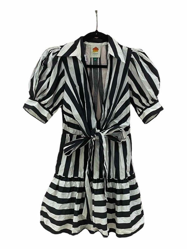 The black and white contrast of this farm rio Black and white Size XS Dress brings a fresh, modern twist to authentic luxury resale. Designed with vertical lines for a flattering look, this pre-loved designer piece showcases a plunging v-neck and playful puff quarter sleeves. The mini silhouette and tie detail add a chic touch, making it a sought-after style in women's consignment fashion. Crafted from a comfortable poly blend and available in size XS, this dress is a unique addition to any curated wardrobe. Experience distinctive fashion from a trusted brand, carefully selected for your next favorite find.