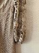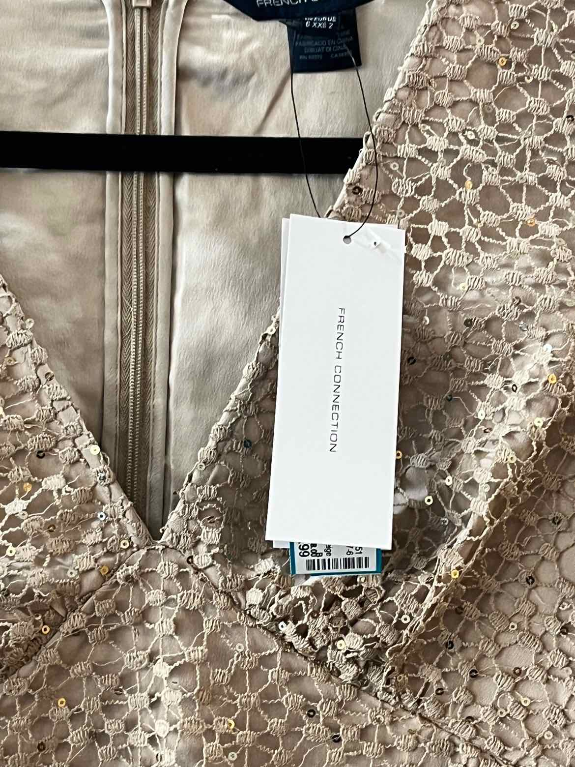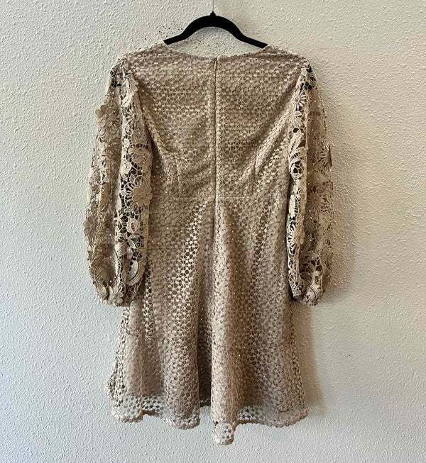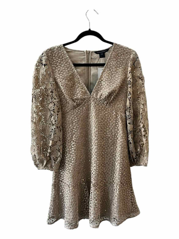 The color and intricate details of the French Connection Beige Size 2 Dress bring a polished touch to any authentic luxury resale wardrobe. This pre-loved designer piece, available through women's consignment fashion, features a solid beige hue accented by subtle gold sequins for a touch of shimmer. The fit and flare silhouette, with long balloon sleeves and open crochet floral eyelets, delivers a refined yet playful look. With its V-neckline, boudoir bust lining, and convenient back zip, this dress showcases both comfort and chic design—making it a special find for those seeking distinctive resale fashion with new-with-tags appeal.