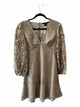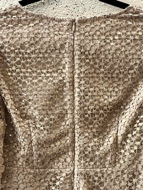 NWT,long sleeve,v neck,solid beige crochet eyelet mini fit and flare dress,boudouir bust lining,subtle gold sequins throughout,open chrochet floral eyelet balloon sleeves,back zip