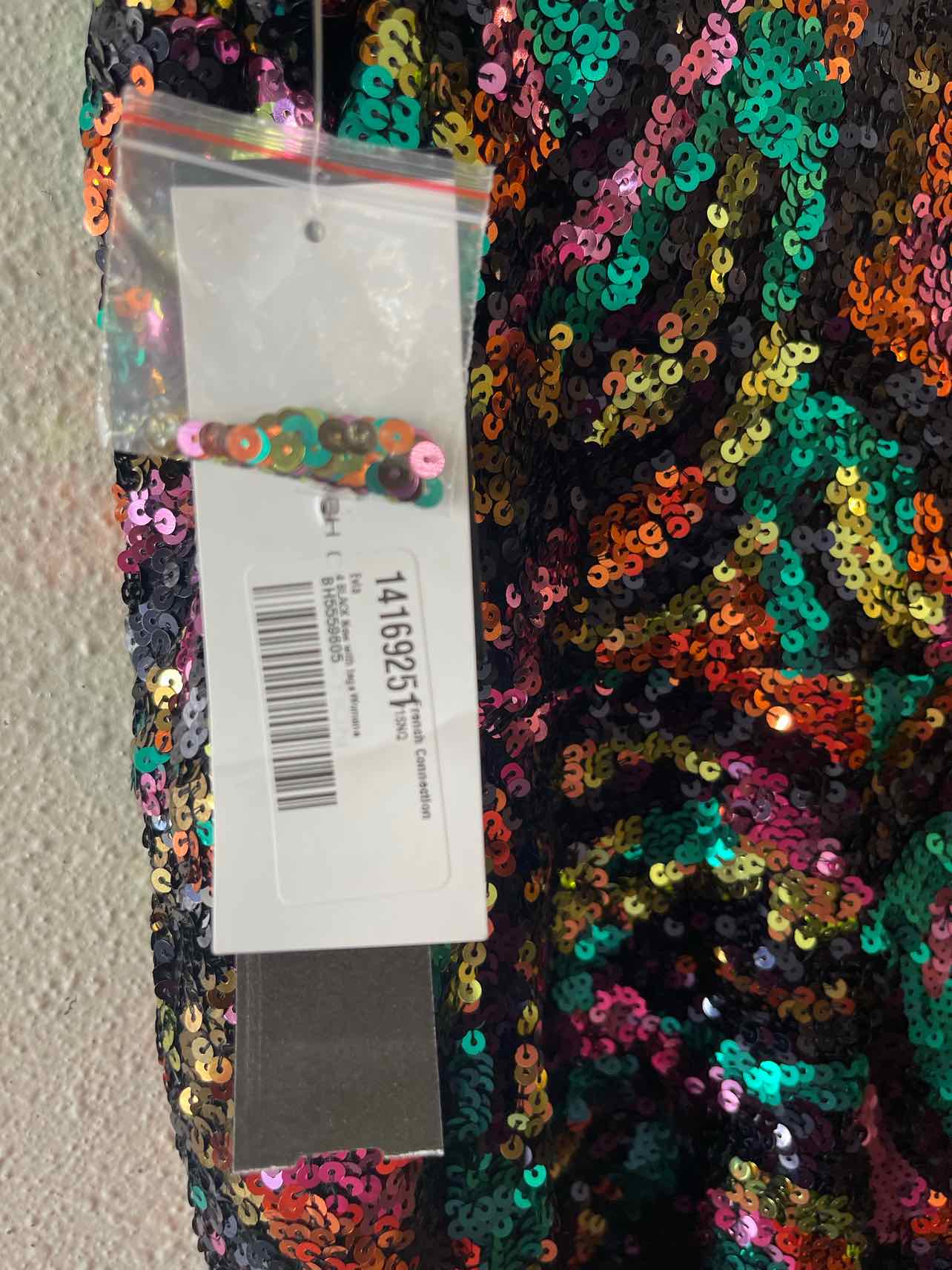 Crafted from shimmering sequin fabric, this French Connection Black Multi Size 4 Dress delivers an eye-catching look for any occasion. The mini silhouette is accented with delicate spaghetti straps and a vibrant palette of green, purple, lime, and orange sequins against a black base, creating a distinctive style within authentic luxury resale and women's consignment fashion. As a pre-loved designer piece, it arrives new with tags, ensuring both quality and exceptional value. Add a unique and polished touch to your wardrobe with this chic dress, curated to enhance your collection.