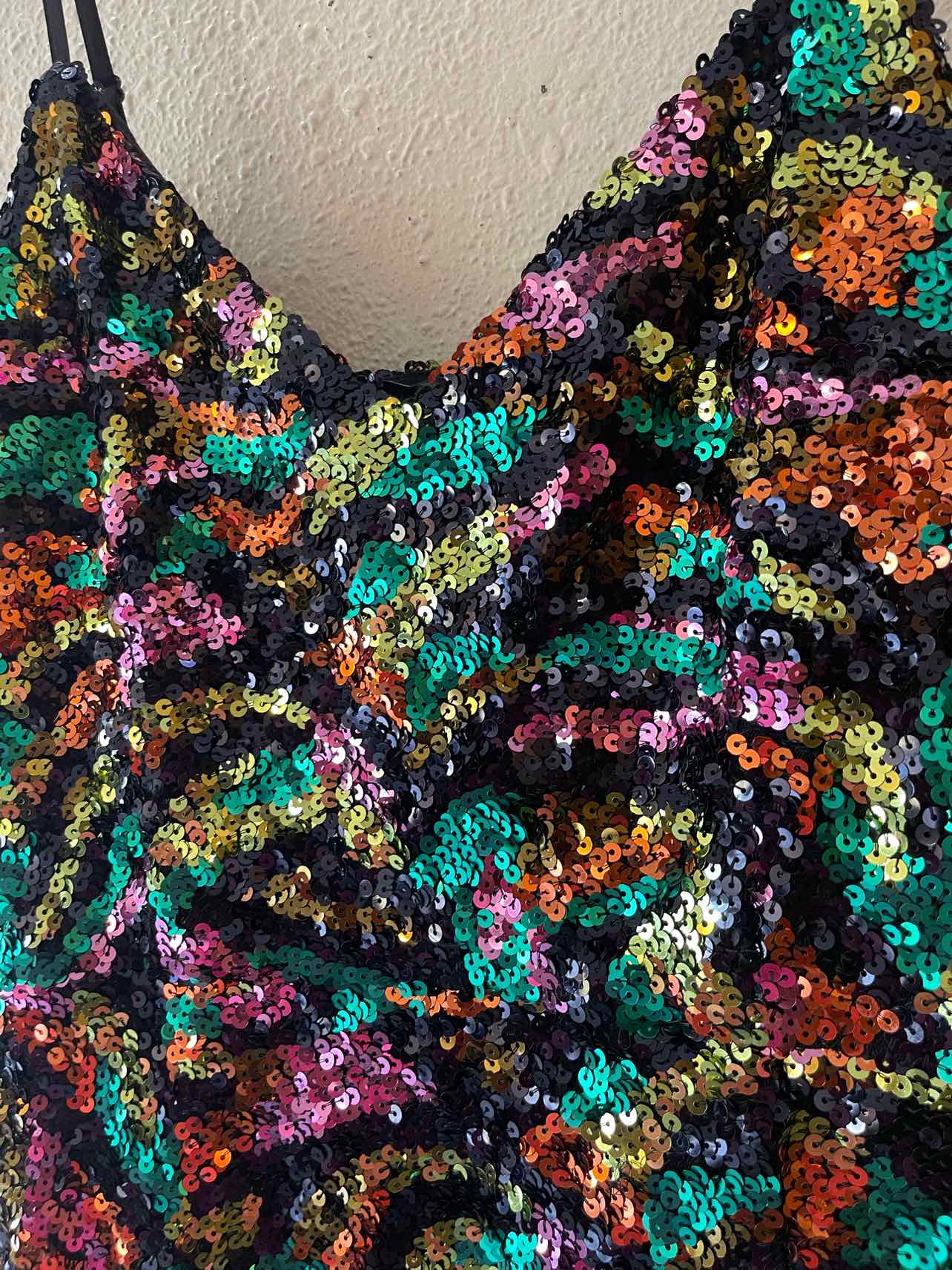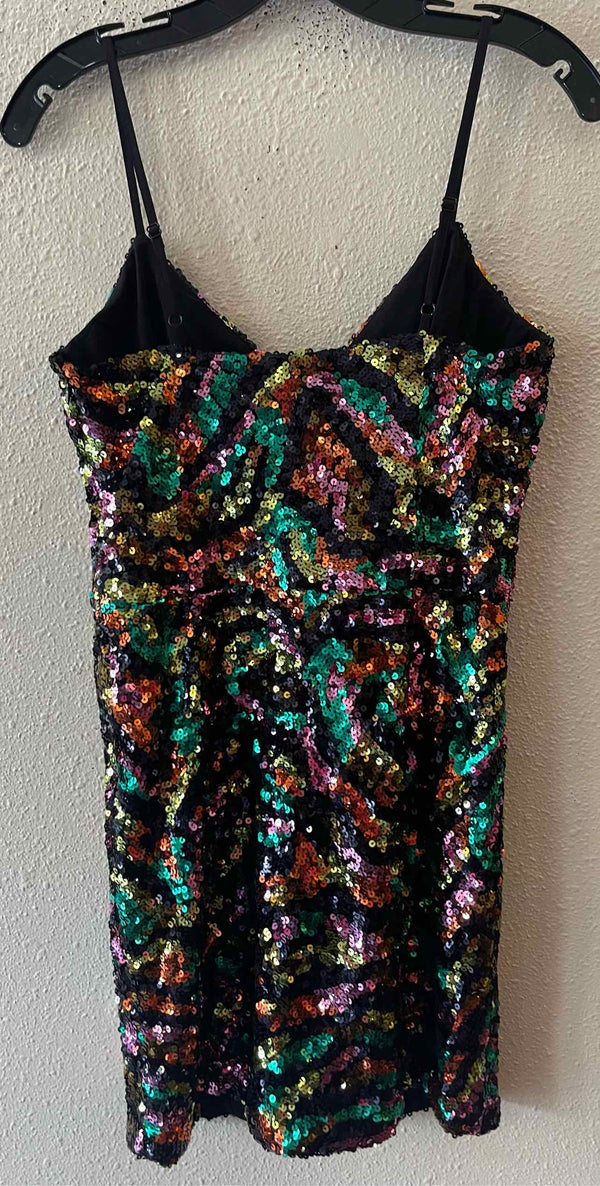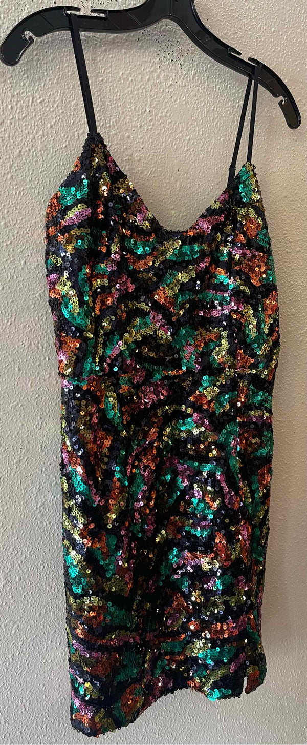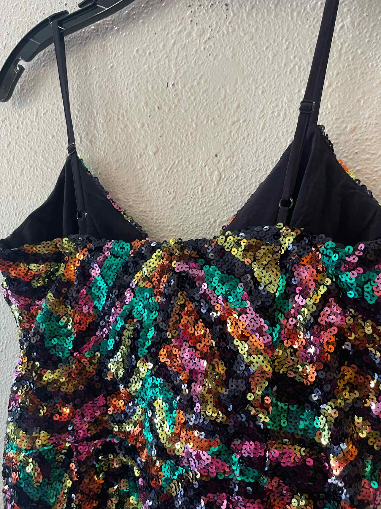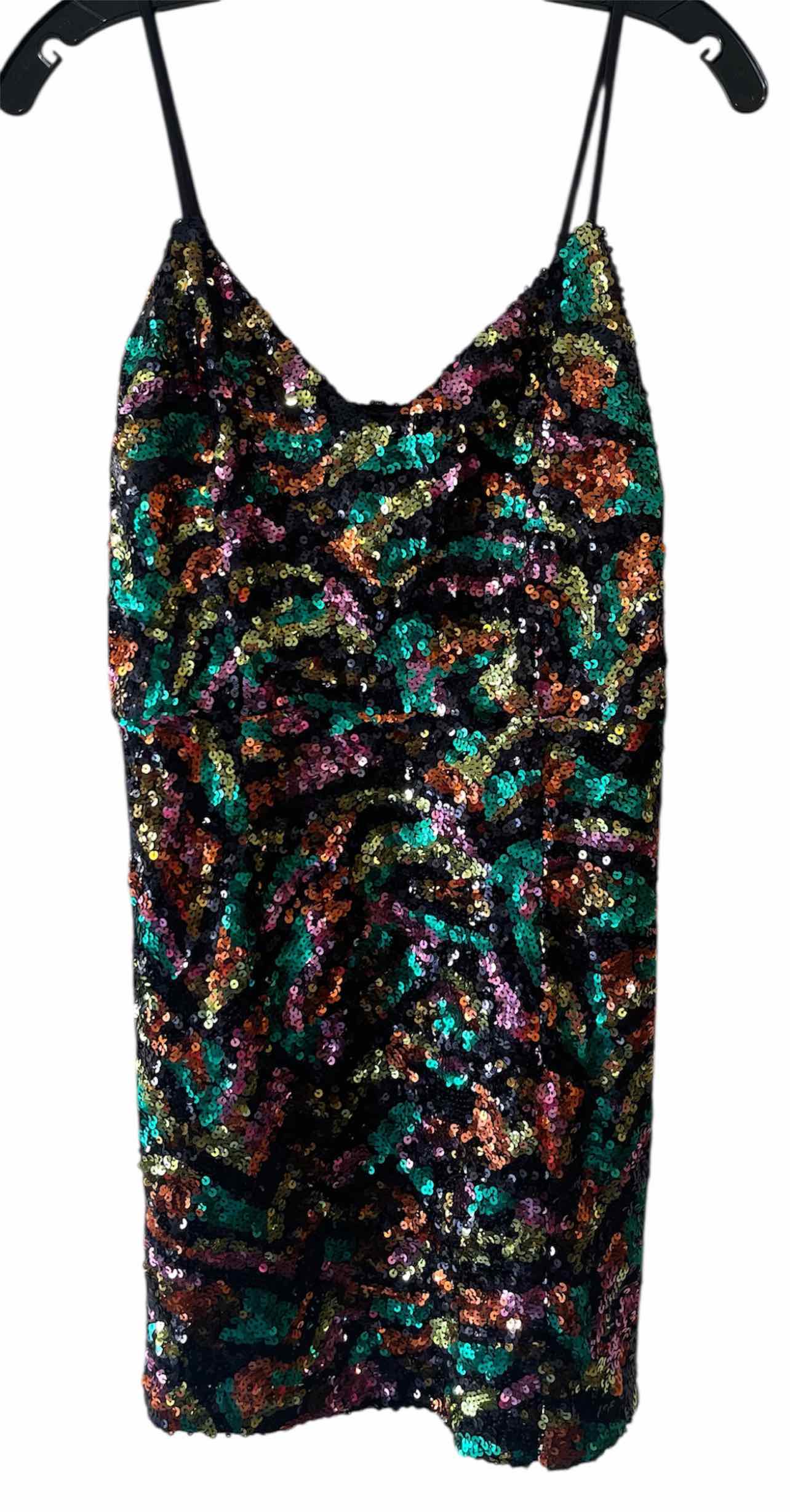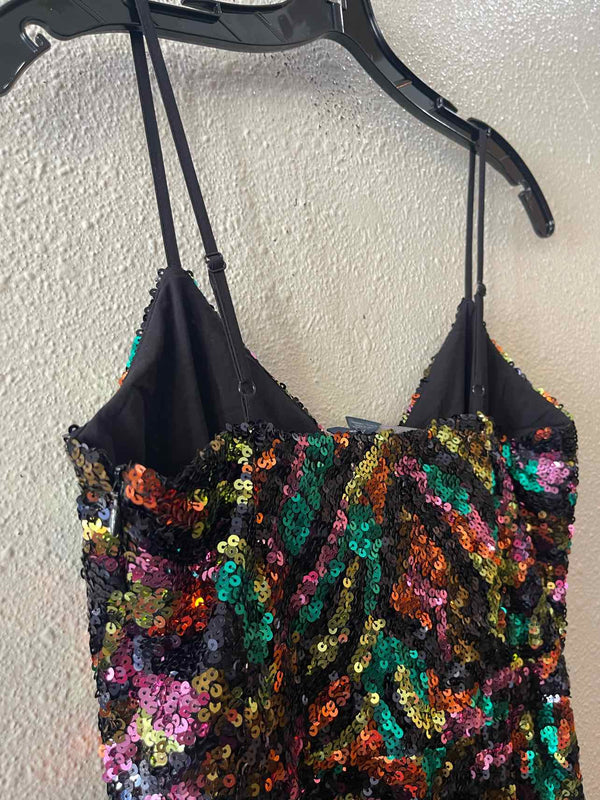 NWT Spaghetti strap, black with green/purple/lime/orange sequin, mini dress