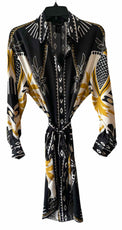 NWT Long sleeve, knee length, black with white/gold flower print, button front, collared dress with matching tie waist belt