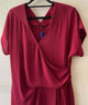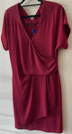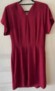 cap sleeve,v neck,above knee,solid garnet,drapped sheath dress,side hidden zip closure,seam detail shoulder pads,draped and gathered bodice,lined