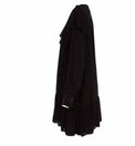 Black, lslv, V-neck, button-fastening cuffs, Ruffled neck and side trims, centre-back pleat