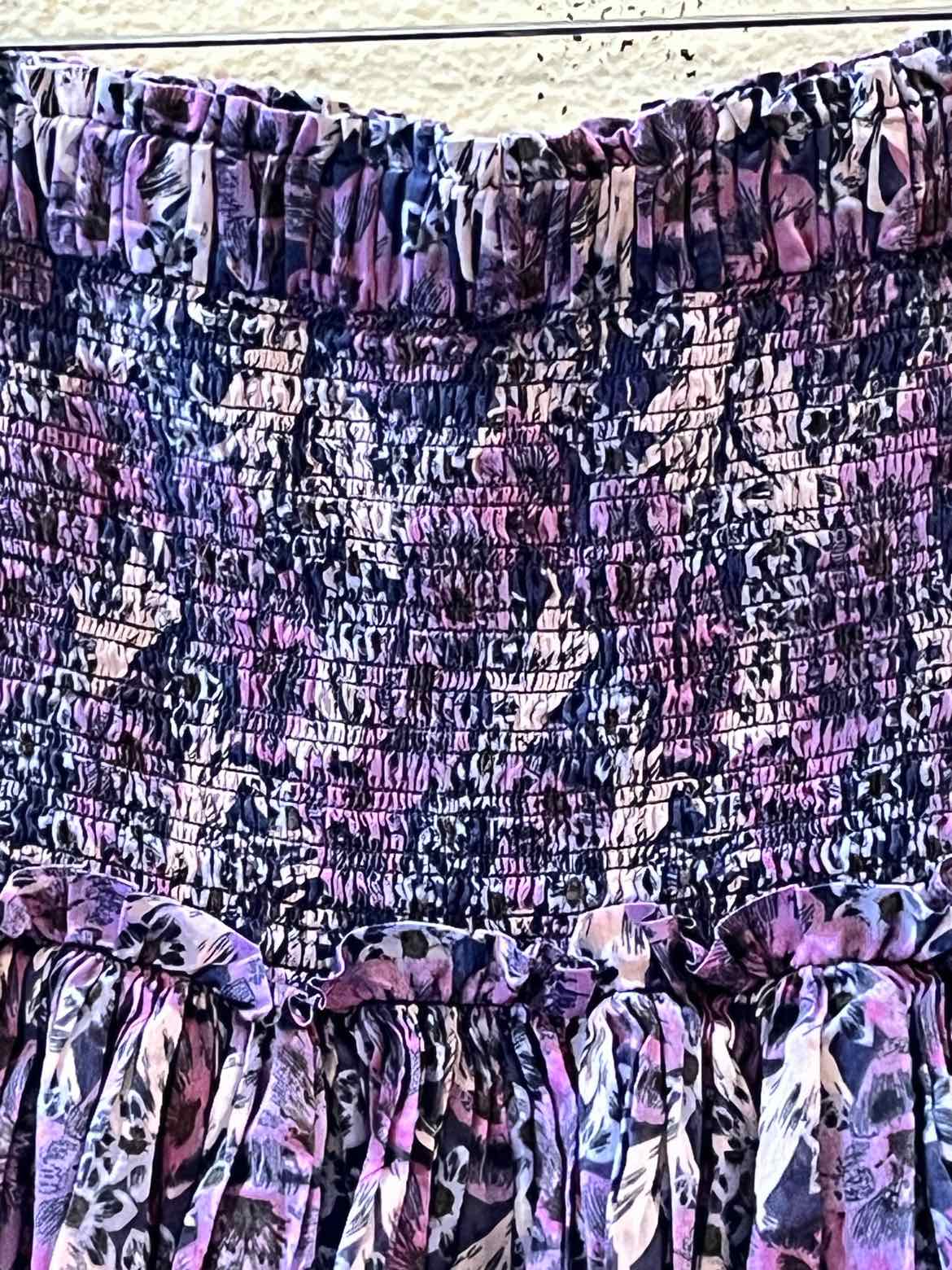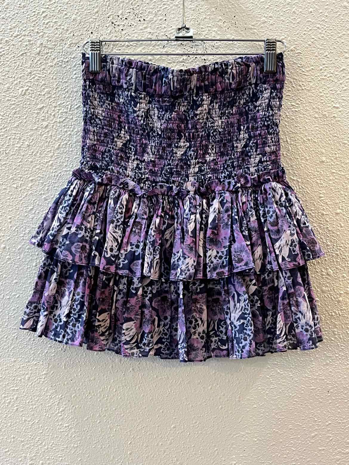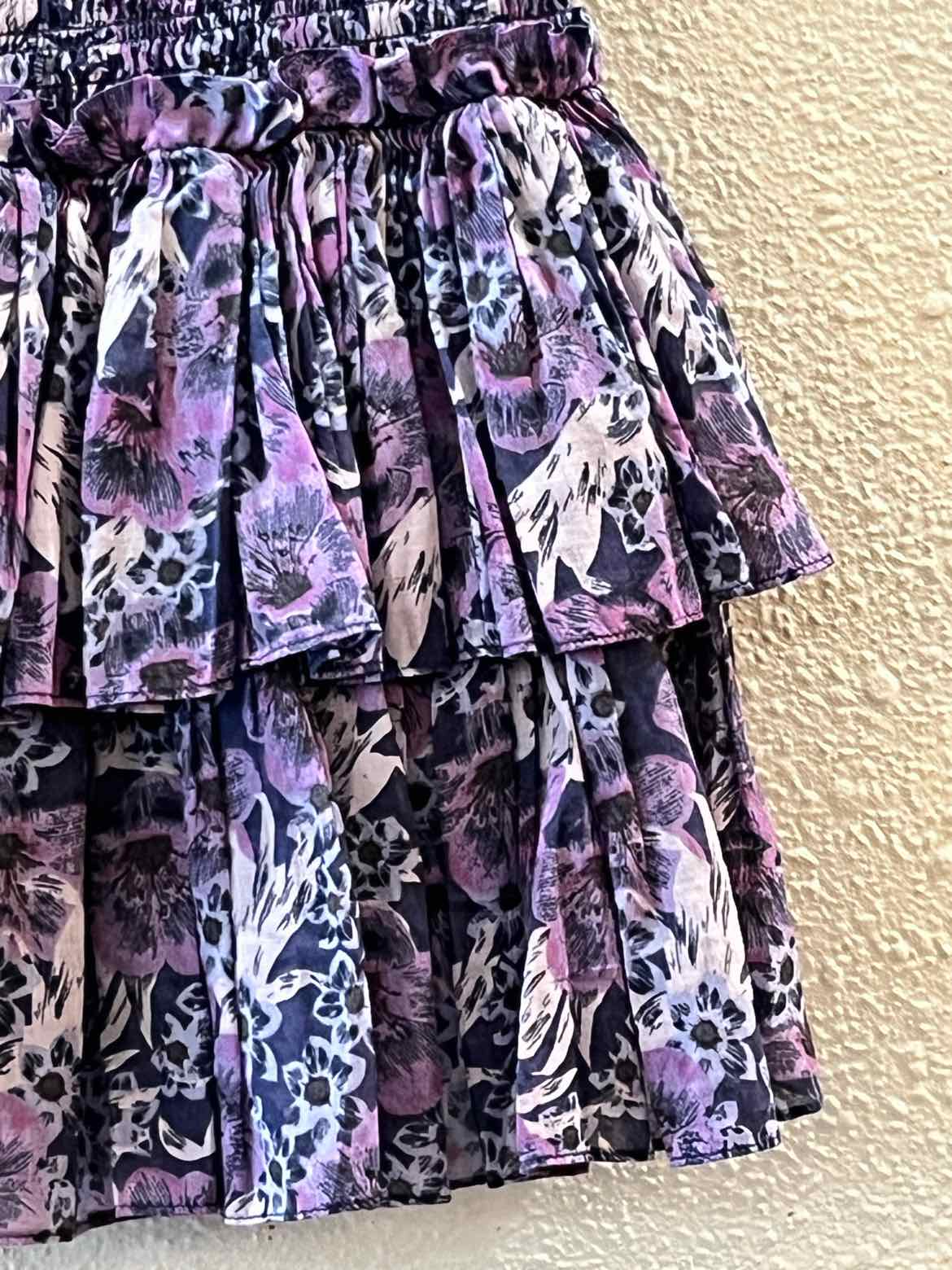 The vibrant multicolored floral design of the Isabel ETOILE Marant Dark Purple Multi Size 36 Skirt brings a playful and refined accent to any wardrobe. As a pre-loved designer piece selected for women's consignment fashion, this skirt combines authentic luxury resale with exceptional comfort. The rich dark purple palette adds versatility, while the tiered ruffled mini silhouette and smocked elastic upper waist create a flattering shape and eye-catching movement. In excellent condition, this unique skirt is a remarkable addition for those seeking curated, high-quality fashion finds.