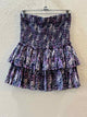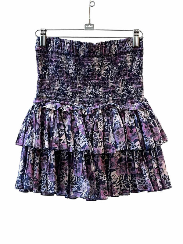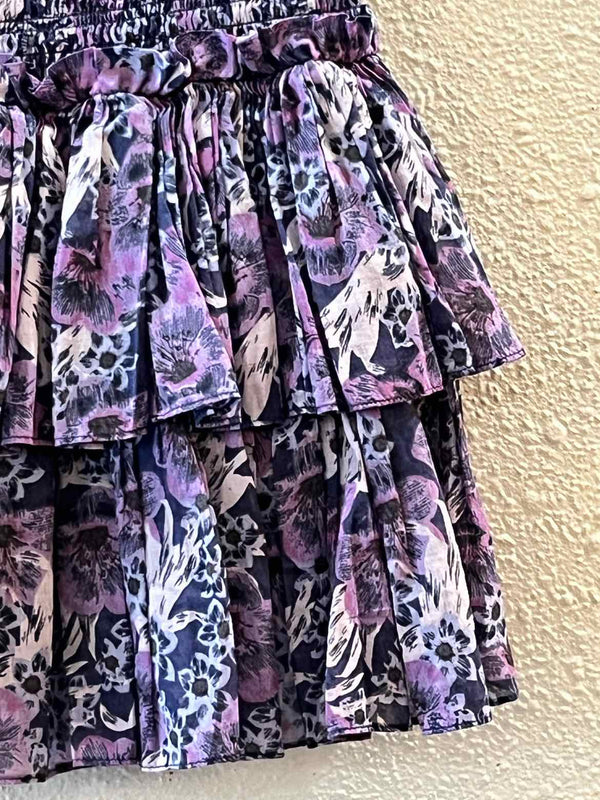 Mid to high rise,smocked elastic upper waist,dark purple tiered ruffled mini skirt,multicolored floral design throughout