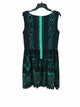 Mini, sleeveless, boat neck, black lace design over green interior, straight torso, ruched flowy skirt, silver zipper on back (green)