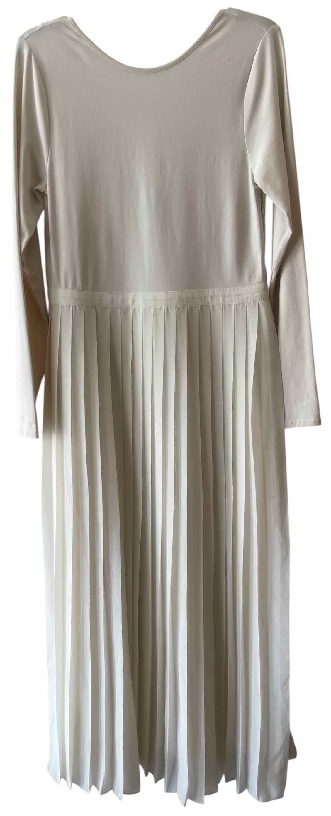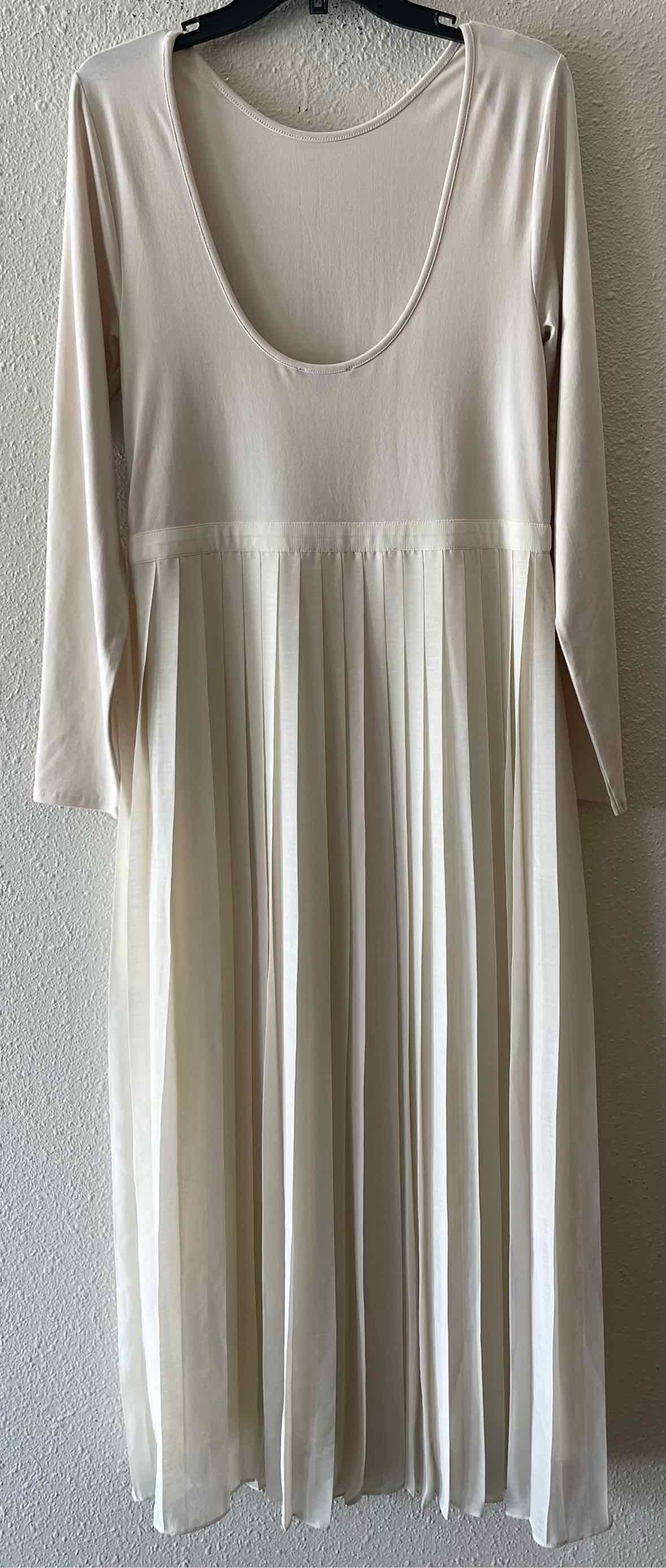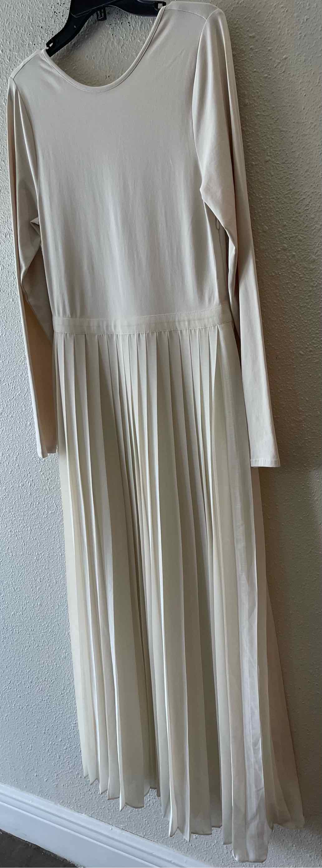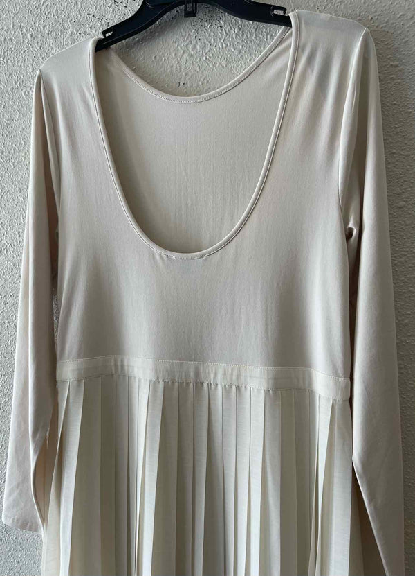 NWT,Long sleeve,jewel neckline,solid cream fit and flare maxi dress,accordian pleating below waist,scoop back