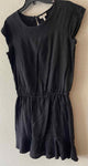 short sleeve,round neckline,solid black,mini linen dress,pullover style,elastic stretch at waist,ruffle at hem,back button clasp keyhole closure