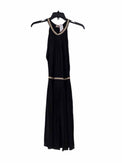 halter, scoop neck, neck and waist deets, flowy, pleated, midi,