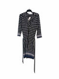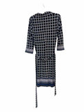 3/4 slv, v-neck collared, mini, geo print in blk/wht/blue, w/cloth belt