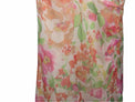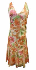 pink multi floral khaki georgeette surplice dress, tank sleeves, midi length, pleated, lined, flowy and lightweight,side zip