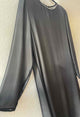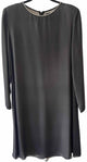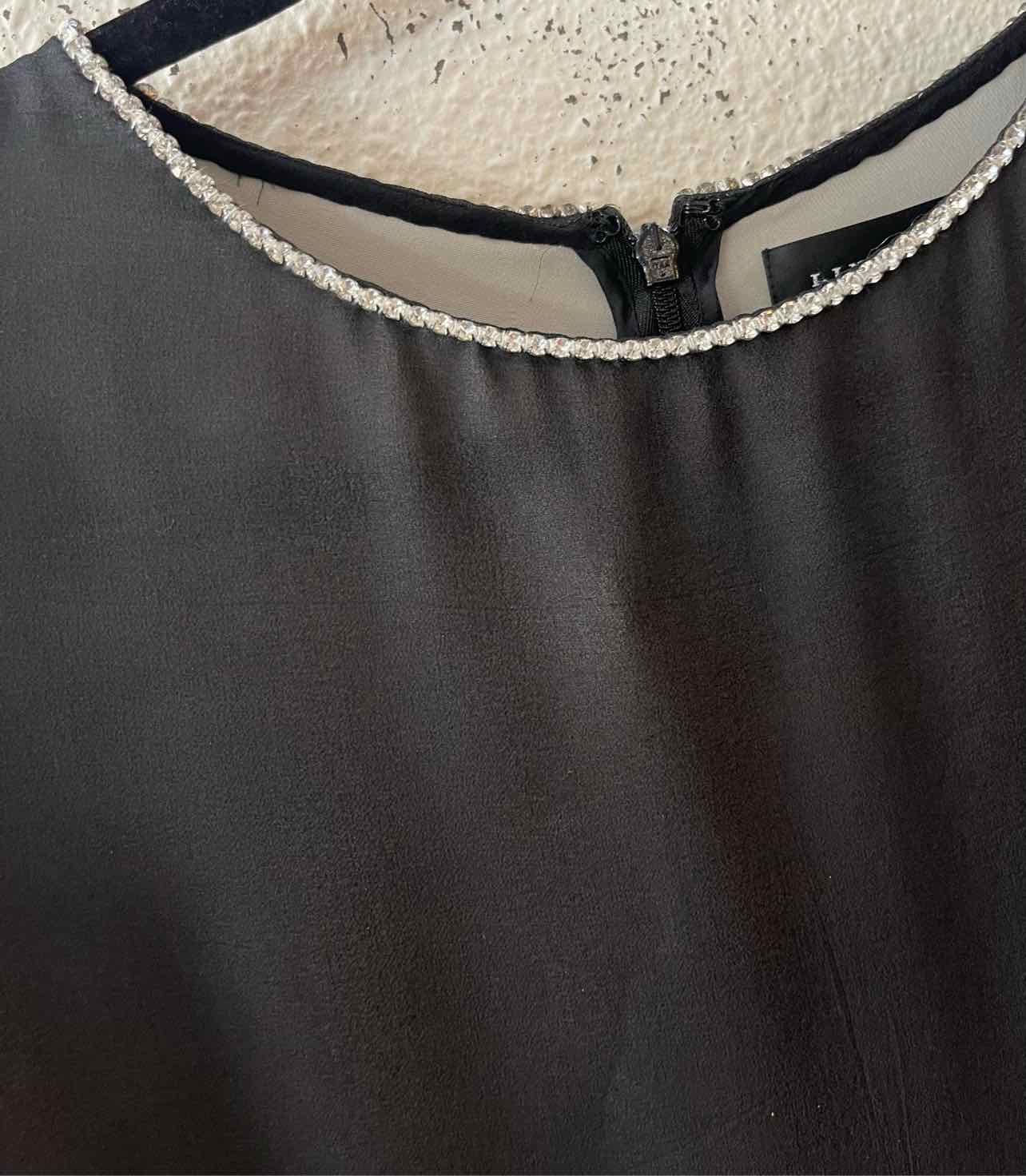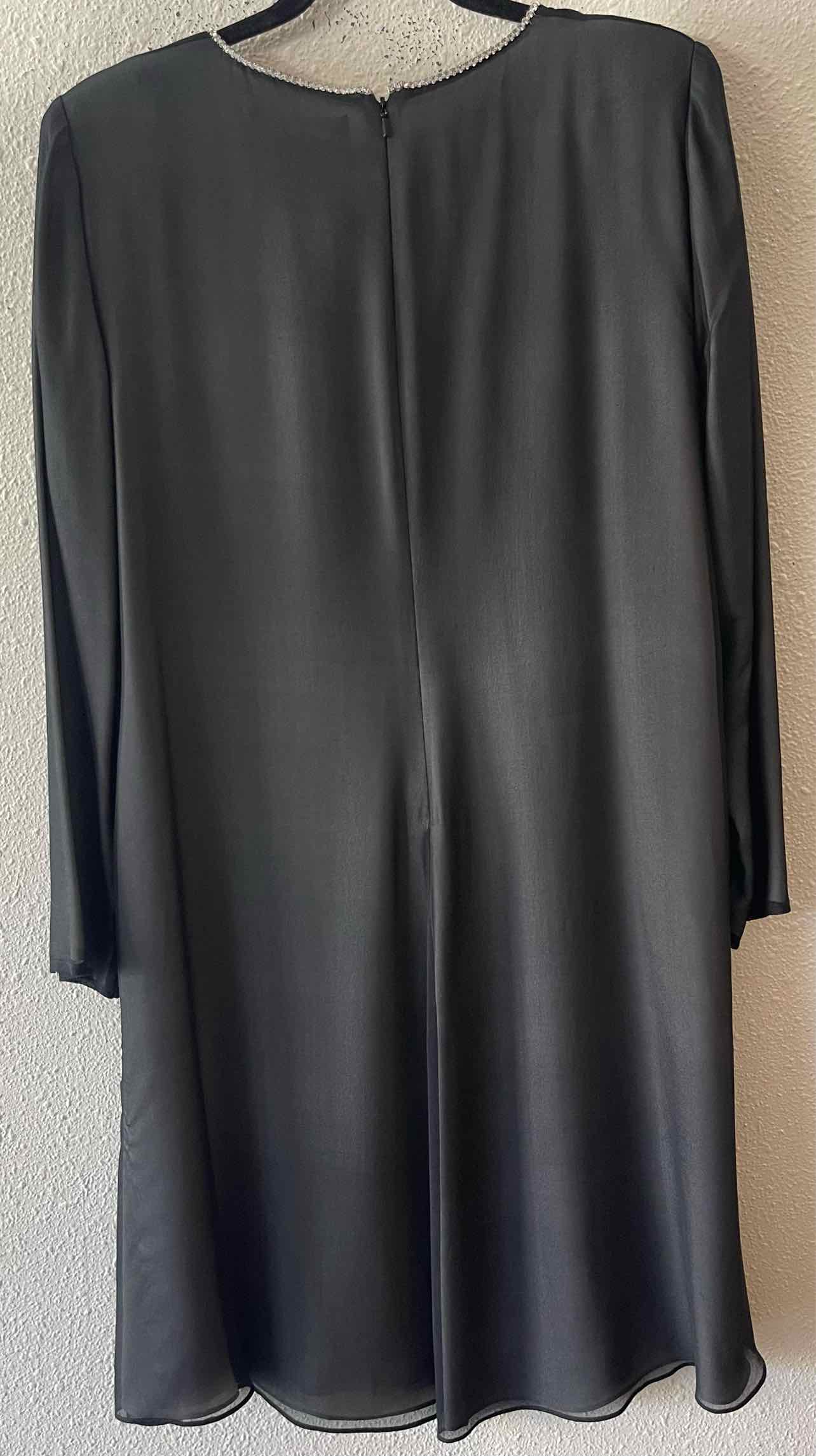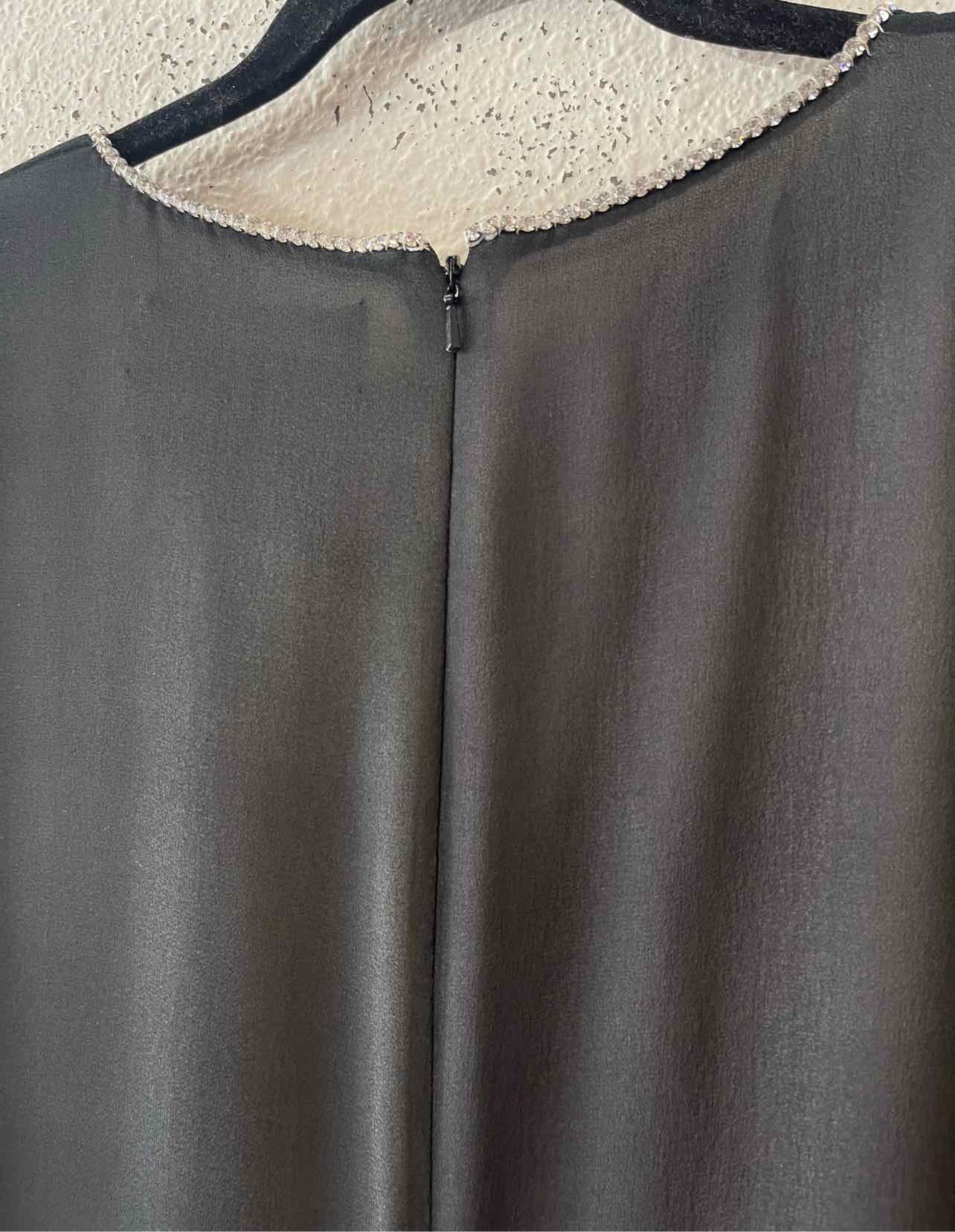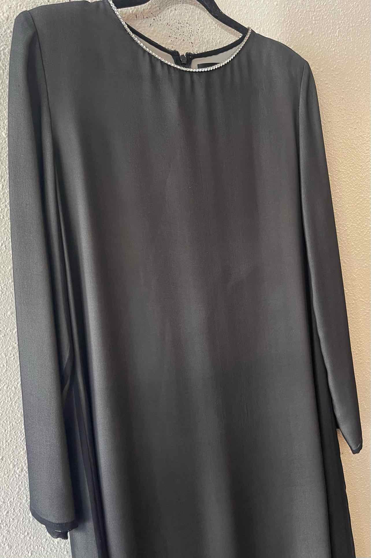Long sleeve,mock neck,above the knee,solid black sheer silk shift dress,rhinestone neckline,pale grey underlay,back zip,padded shoulders