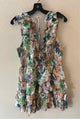Sleeveless mini, white with multi color, floral, tiered ruffle, smocked bodice dress