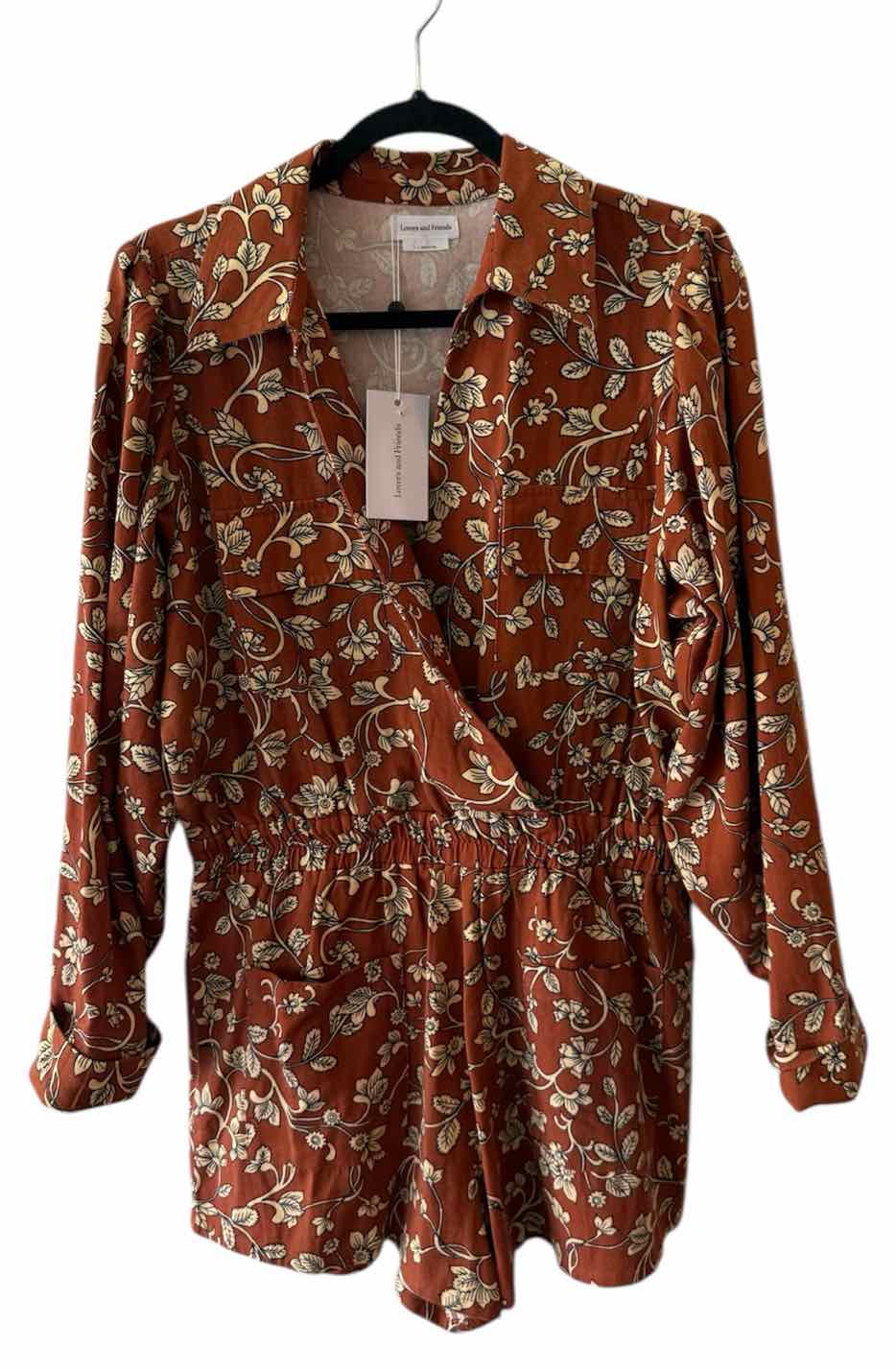 The rust multi Olivia floral print of the Lovers and Friends Rust Multi Size L Romper brings vibrant energy to any women's consignment fashion collection. This pre-loved designer piece from authentic luxury resale features long blouson sleeves, a surplice neckline, and practical front flap and side patch pockets. With an elastic waistband for comfort and an above-knee silhouette, this romper offers a beautiful blend of style and ease. New with tags, it’s a remarkable find for those seeking a unique touch through premium designer resale.