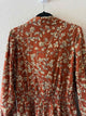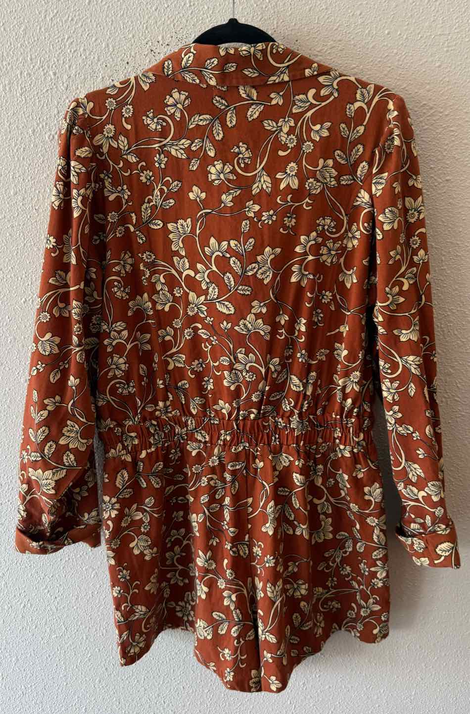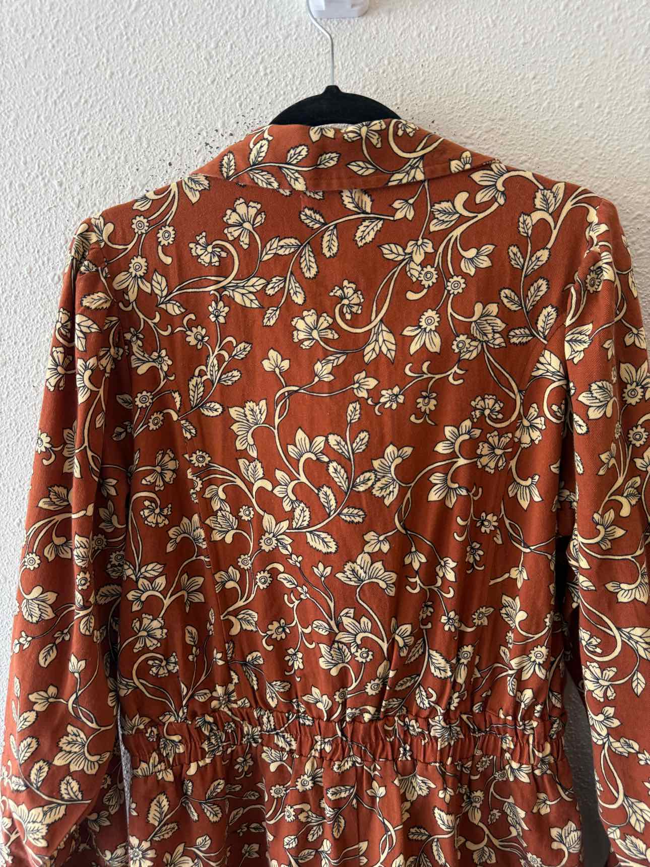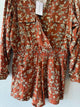 NWT,long sleeve,surplice neck,above knee,rust multi,Olivia floral print romper,blouson sleeves,elastic waistband,front flap pockets,side patch pockets