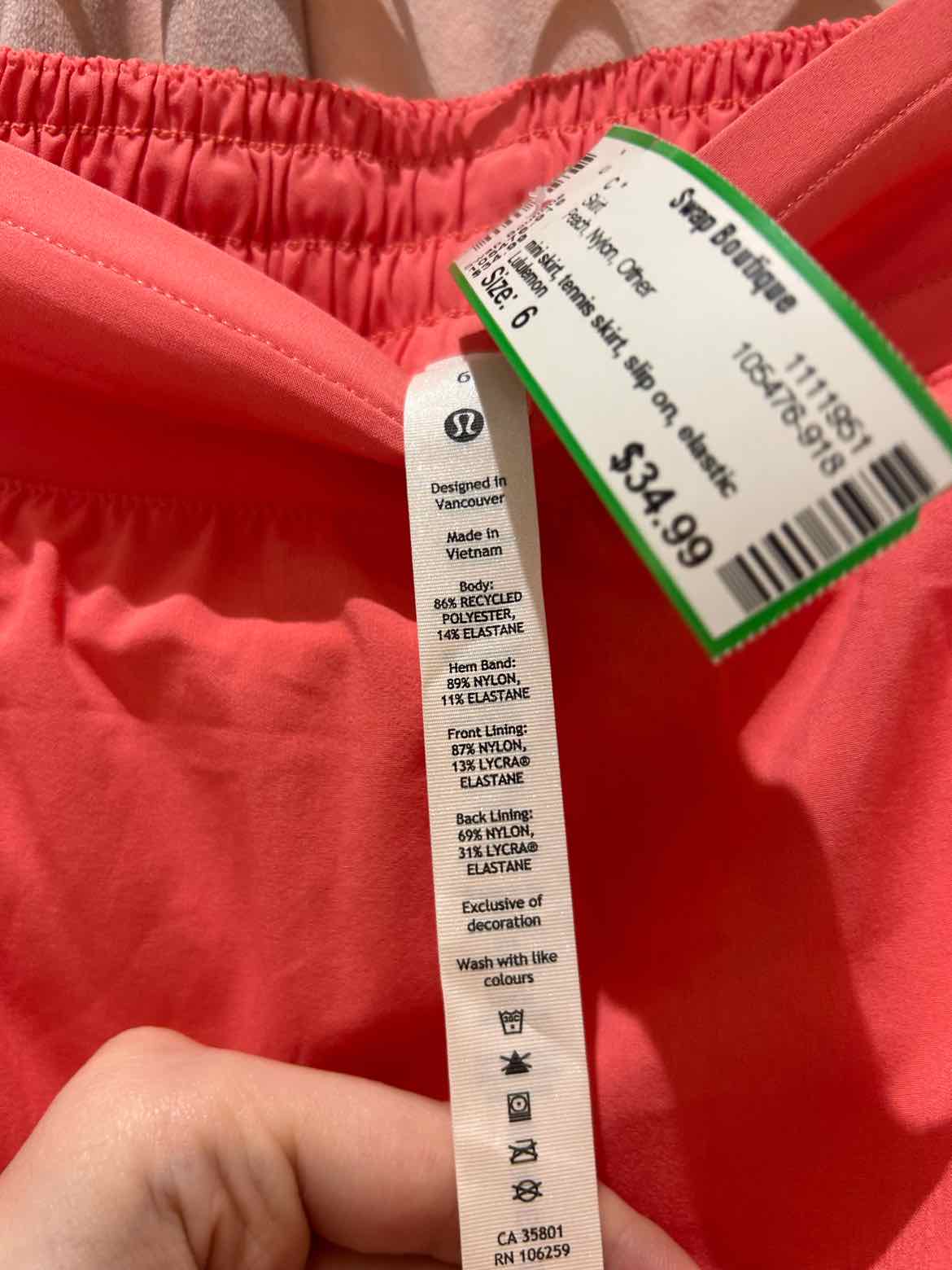 The peach hue of the Lululemon Peach Size 6 Skirt brings a fresh touch to authentic luxury resale and women's consignment fashion. This pre-loved designer mini tennis skirt features an easy slip-on design with an elastic waist that adds everyday comfort. Side zipper pockets introduce practical storage while maintaining a clean, sporty look. Crafted from nylon and categorized as a skirt, this size 6 piece reflects Lululemon’s active aesthetic in a versatile silhouette. Offered through an authentic luxury resale experience, it’s a polished option for anyone seeking pre-loved designer style from Baton Rouge in a compact, wearable shape.