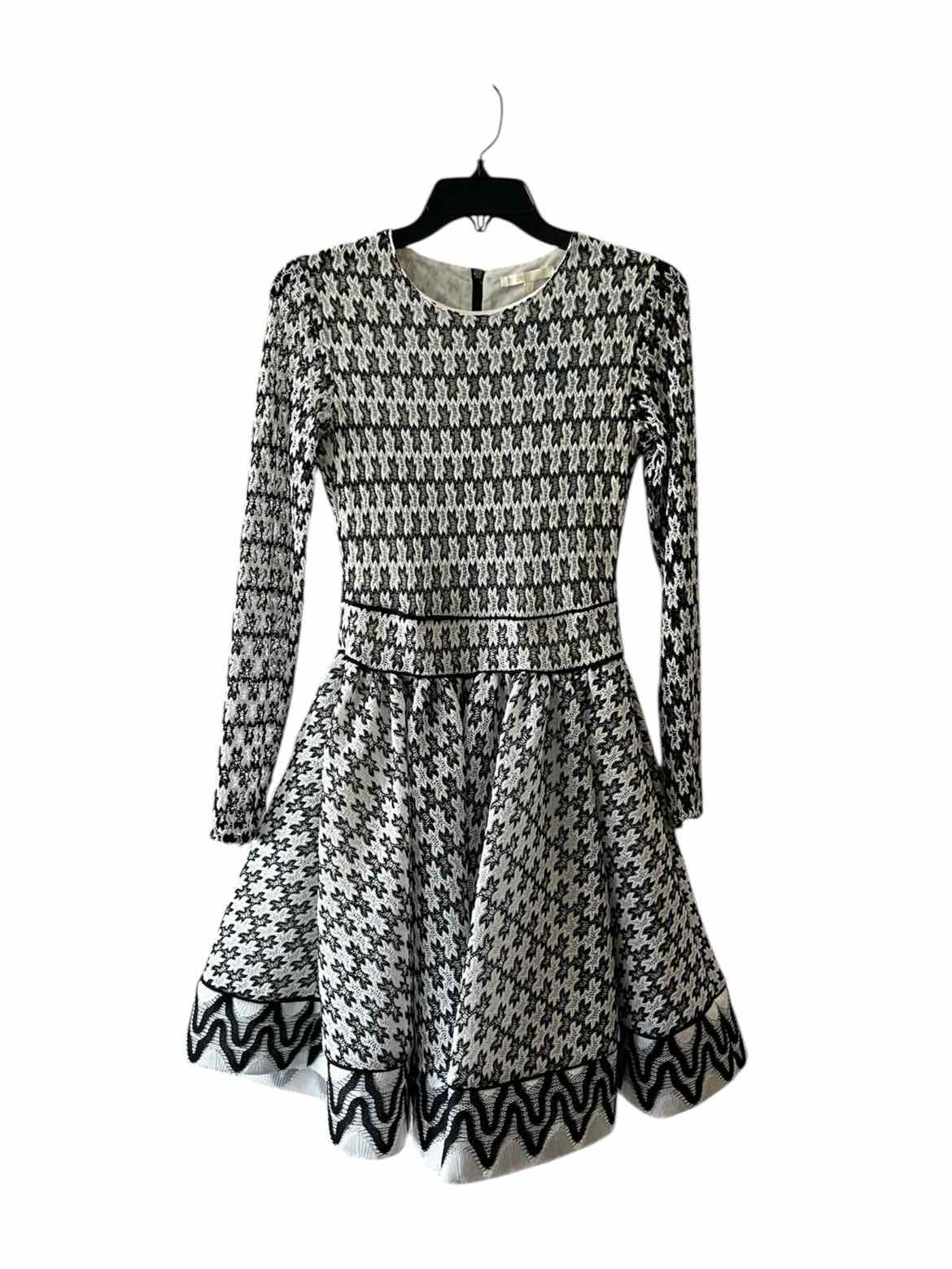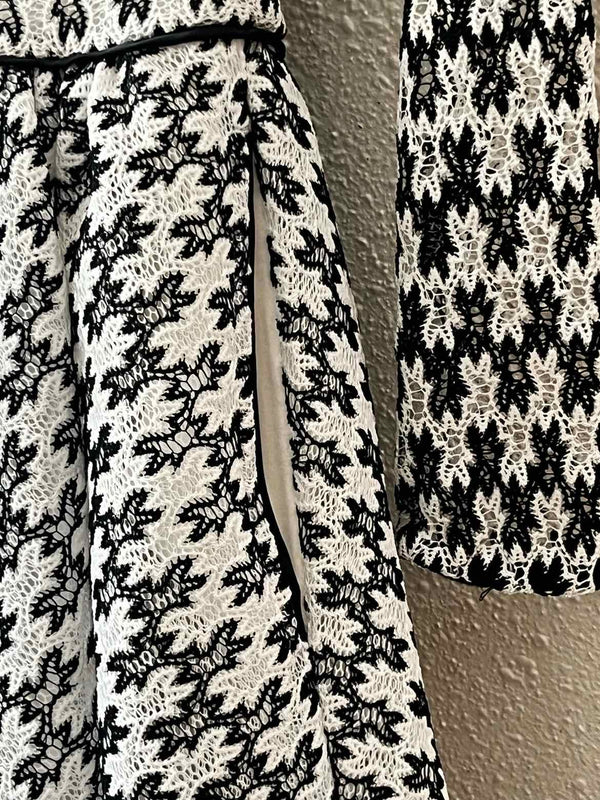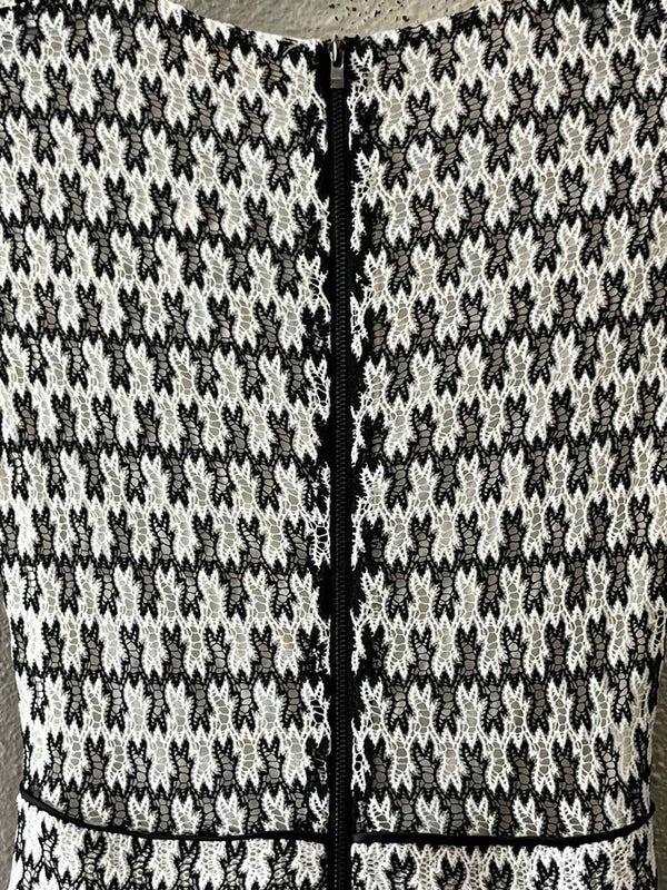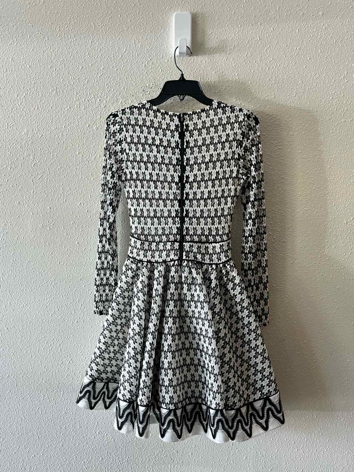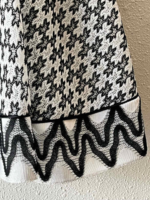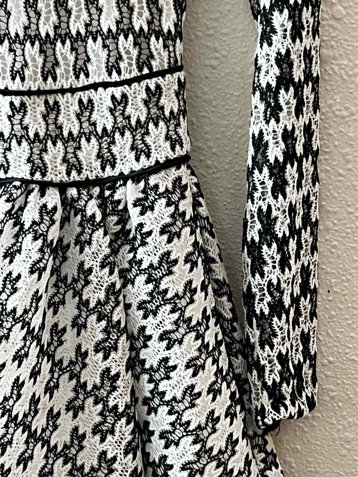 Long sleeve,mock neck,black and white abstract knit eyelet mini a line dress,white mesh underlay,built in black raised tubule trim waistband,squiggle line mesh panel at hem,pockets with black trim,back zip