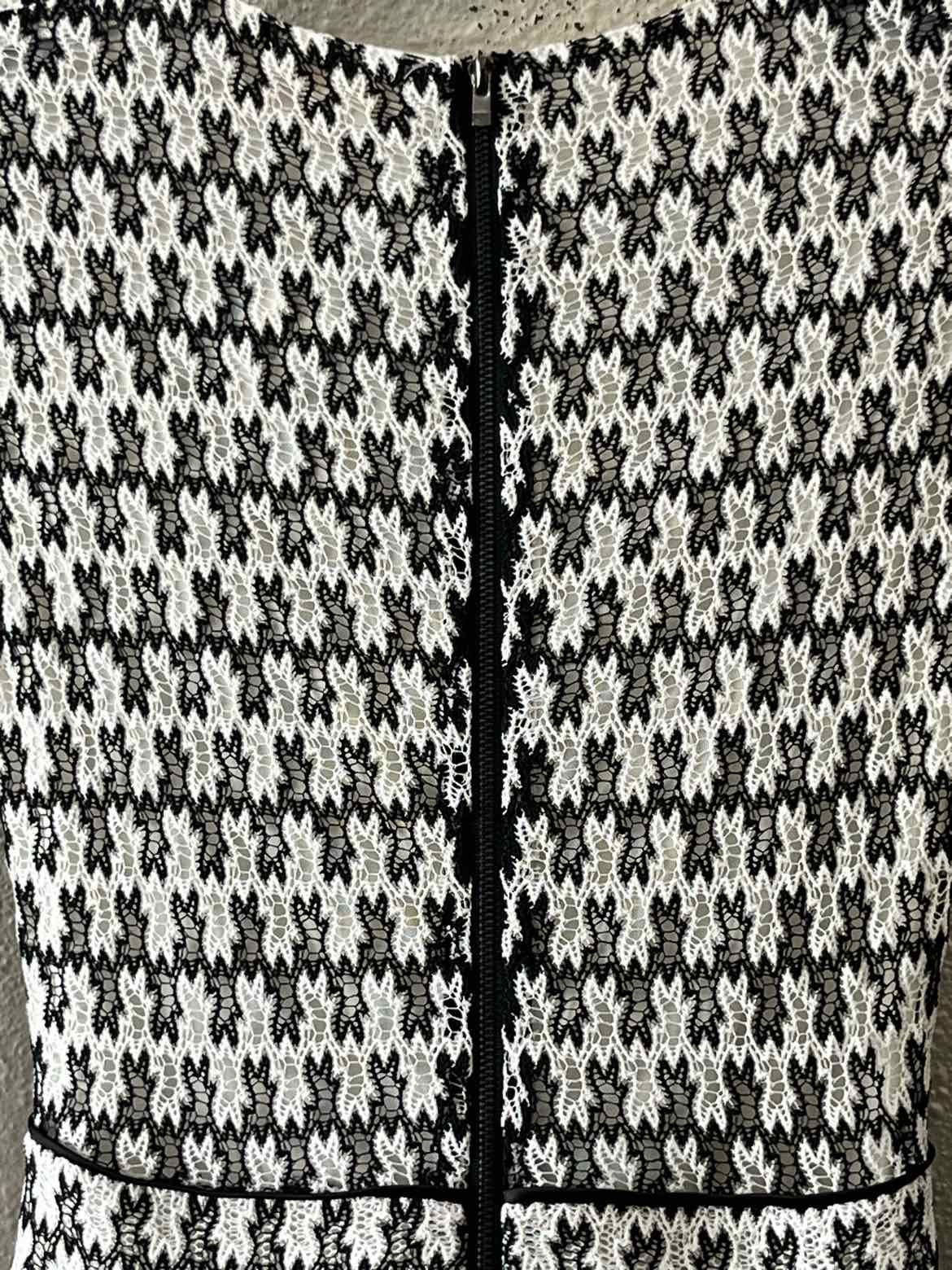 The black and white pattern of this Maje White and black Size 2 Dress brings a modern edge to classic women's consignment fashion. This pre-loved designer piece from the authentic luxury resale collection features an abstract knit eyelet design and a chic mock neck. Thoughtful details like a built-in raised tubule waistband, squiggle line mesh panel at the hem, and pockets with black trim offer a distinctive look while remaining versatile. With a white mesh underlay and back zip closure, this mini A-line dress is in very good condition, ready to refresh your curated wardrobe.