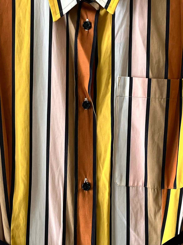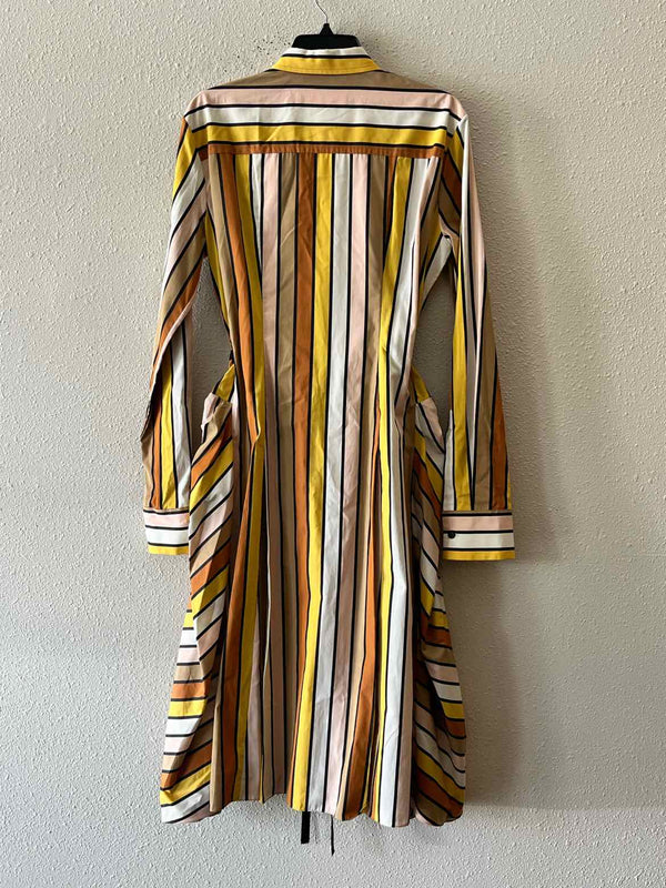 The multicolored vertical stripes of the Marni Multi Size 46 Dress bring a fresh, modern flair to authentic luxury resale. This pre-loved designer piece features a fit and flare midi silhouette, long sleeves, and a collared, button-down front for a polished yet creative look. A built-in black waist tie defines the cinched waist, while a frayed, shirred strip with ruffling at the hem adds a unique touch. Crafted in a palette of black, white, camel, light brown, and blush, this women's consignment fashion find is presented in excellent condition, offering a distinctive addition to your wardrobe.