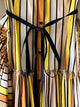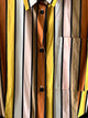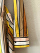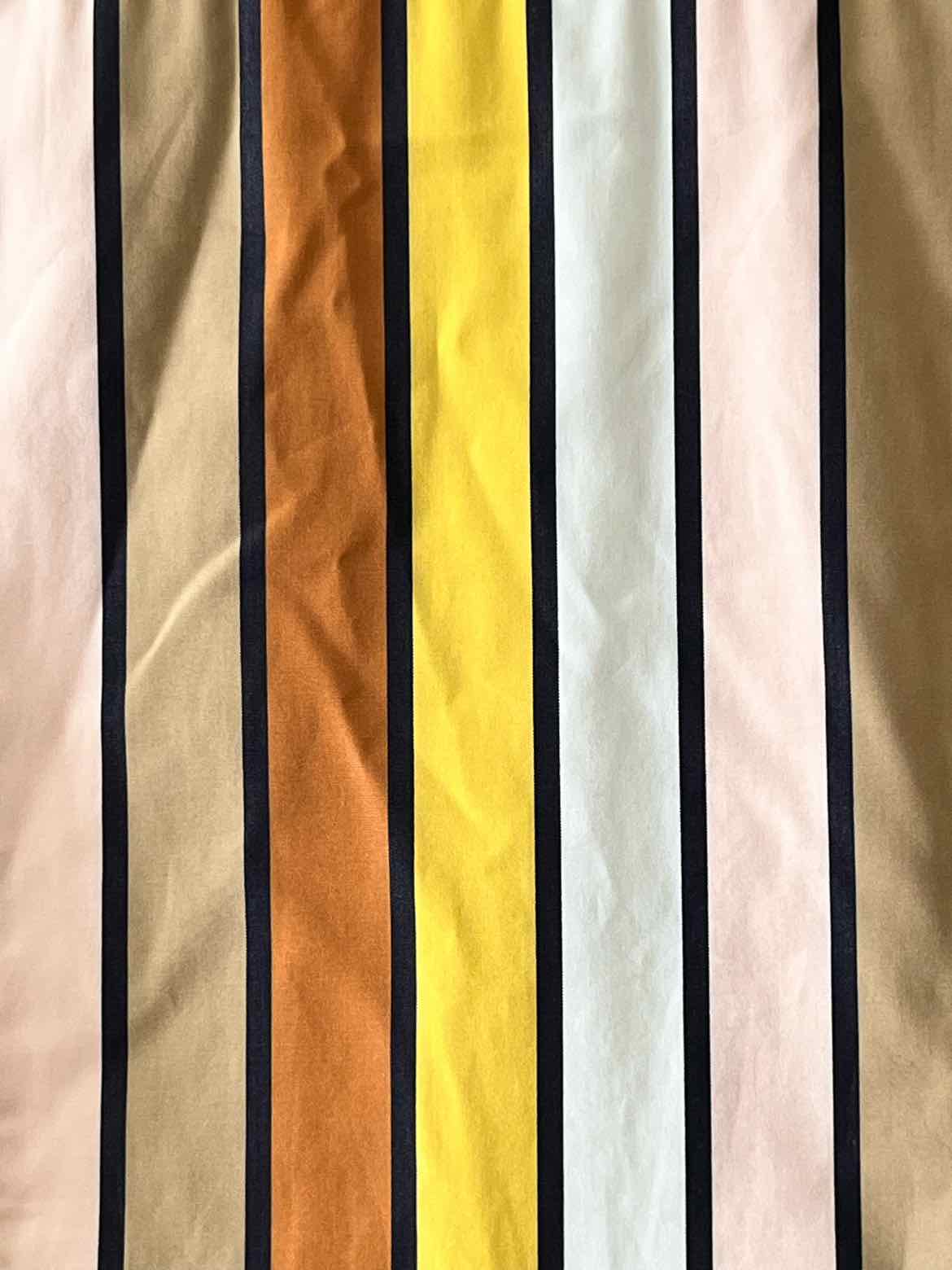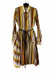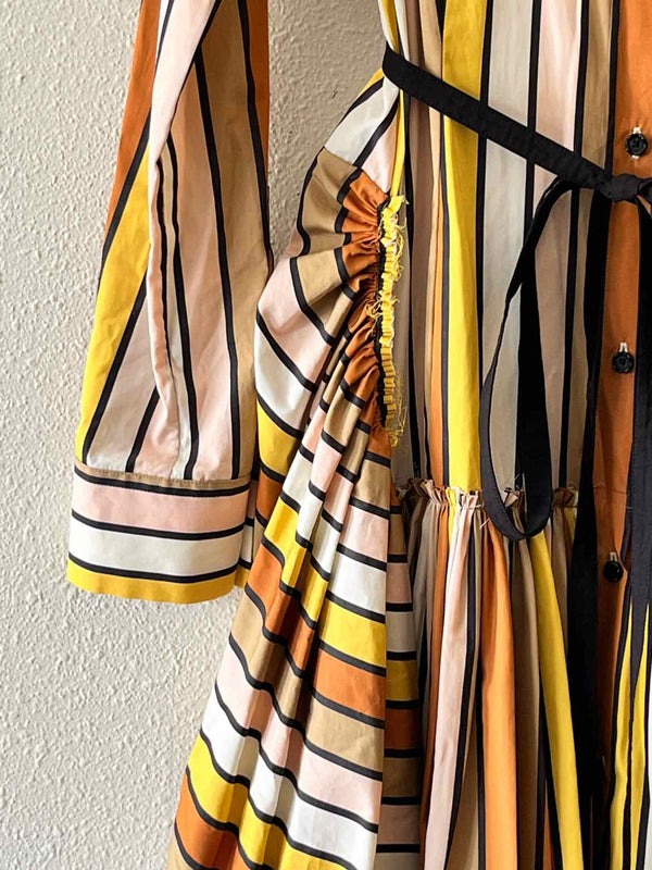 Long sleeve,collared,button down,multicolored fit and flare midi dress,multicolored vertical stripe design,black,white,camel,light brown,light blush,breast pocket,frayed shirred strip with ruffling at bottom,built in black waist tie,cinched waist,button c