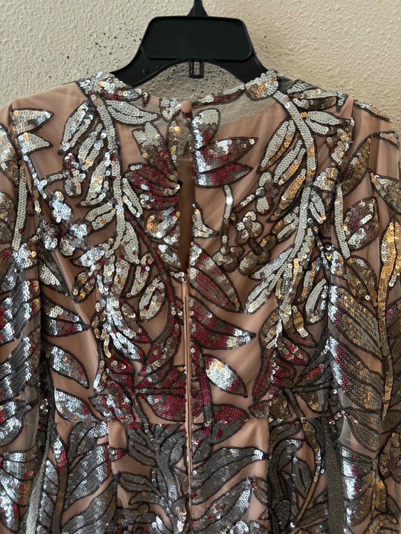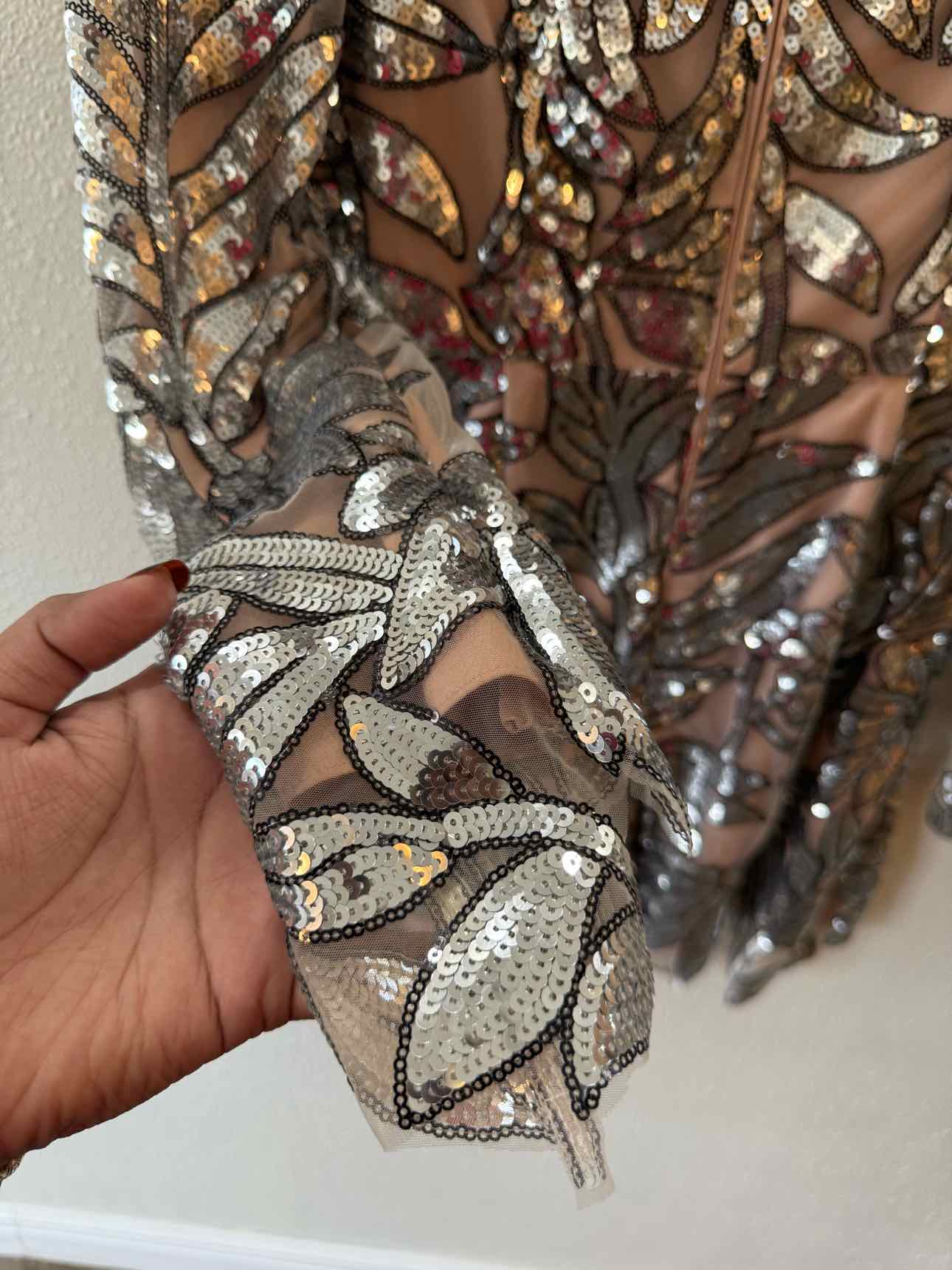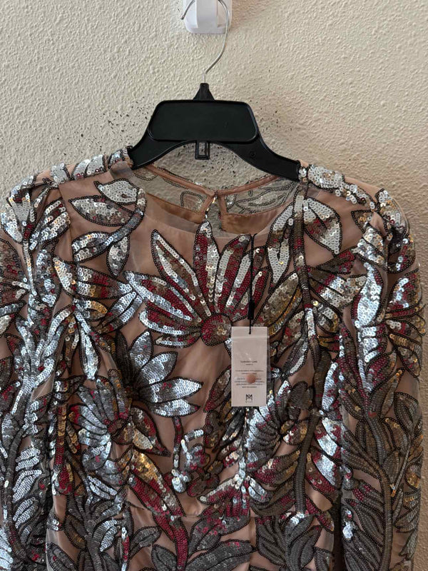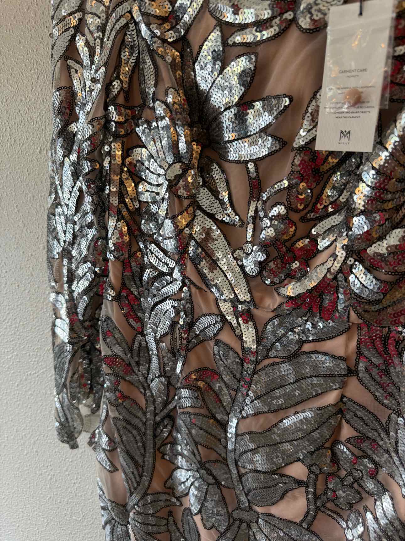 The silver and nude tones of the Milly Silver and Nude Size 4 Dress bring a refined touch to any women's consignment fashion collection. With its Scottie floral sequin mesh, long sleeves, and chic above-the-knee silhouette, this authentic luxury resale piece is new with tags and carefully curated for those who value pre-loved designer style. The dress features a crew neck and elegant button keyhole detail, complemented by a nude lining and back zip closure for easy wear. Discover how this beautiful Milly dress can transform your wardrobe with its unique blend of color and texture.