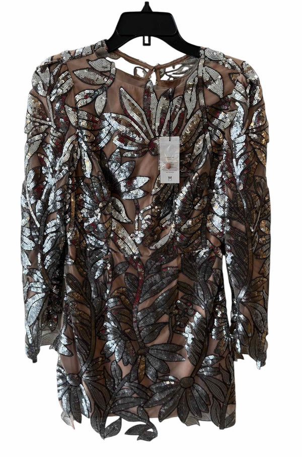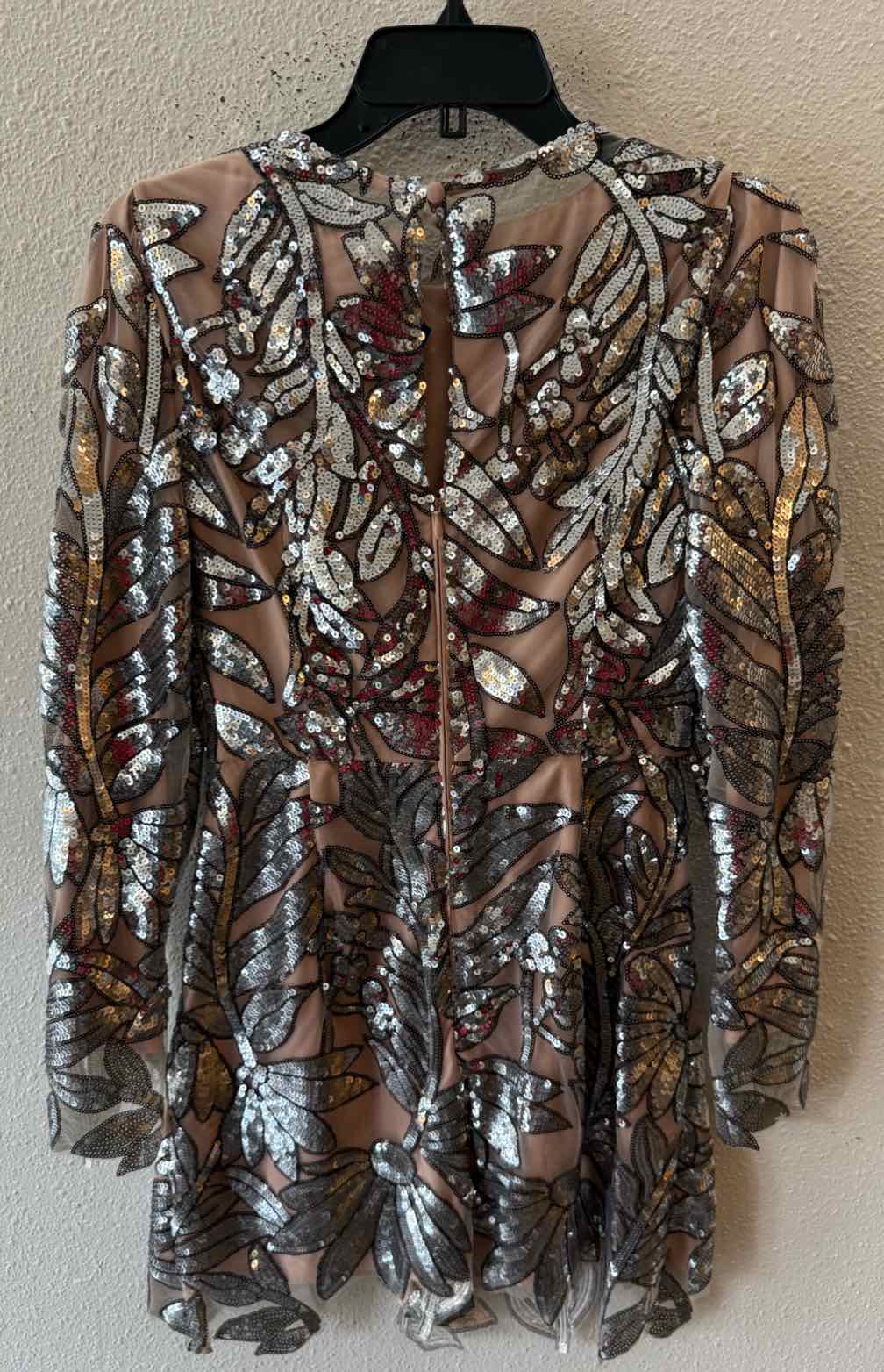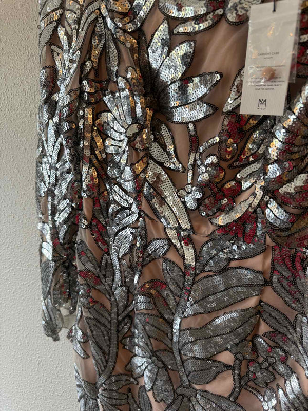 NWT,long sleeve,crew neck,above knee,Scottie floral sequin mesh mini dress,button keyhole,back zip closure,nude lining