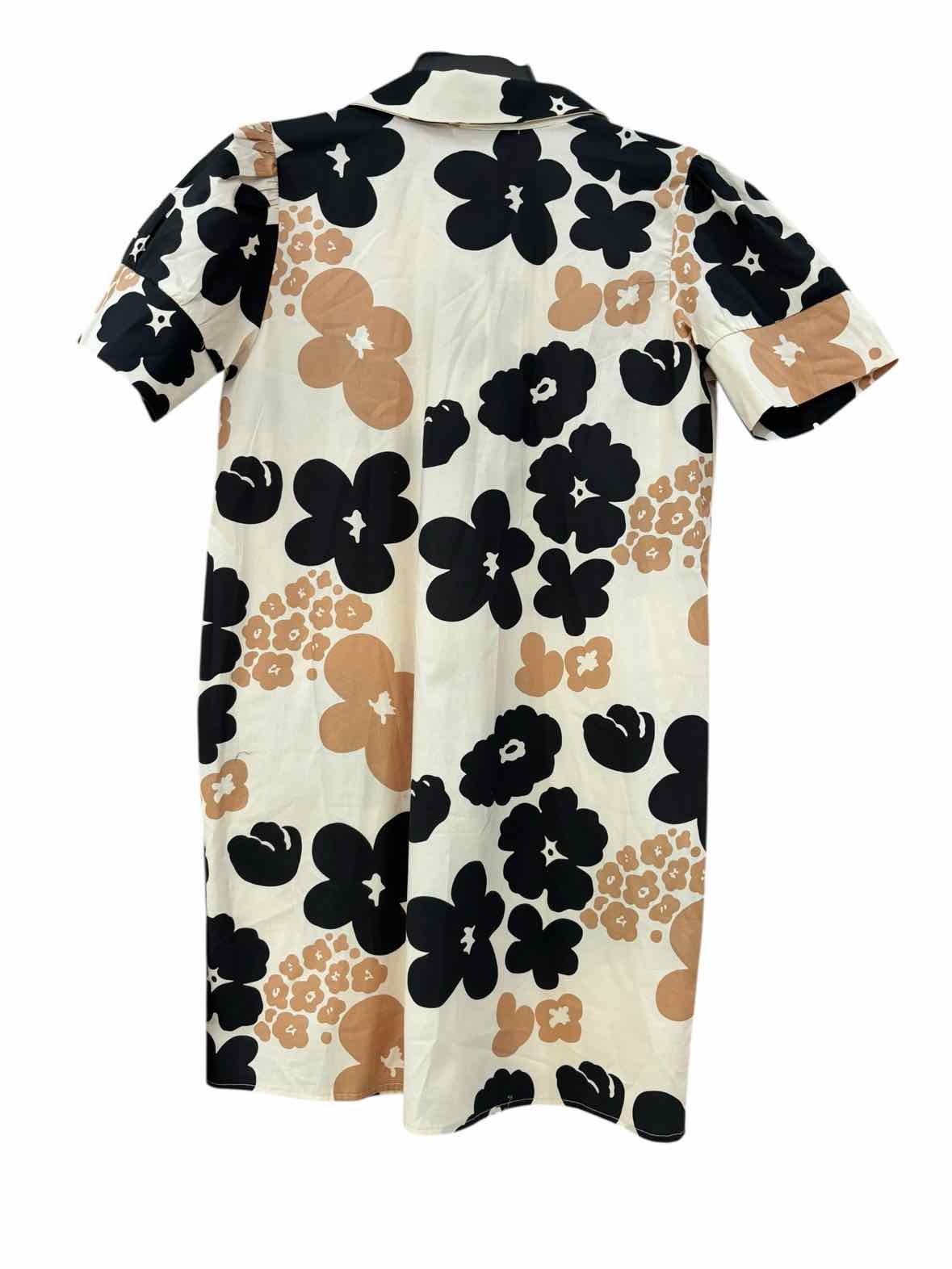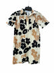 mini, cream with black/tan florals, short puff sleeve w/ cuff, shirt collar, 1/2 button down