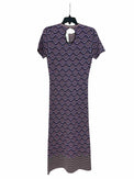 nwt- round neck, ss, maxi, fitted, purple black pink geometrical designs, bottom stripes of purple black and pink, snap button on back of neck
