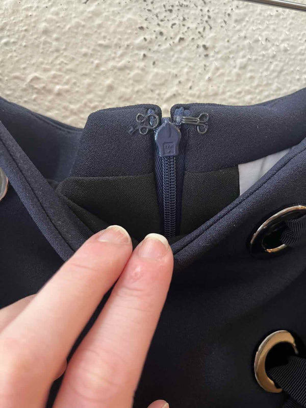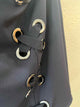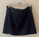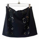 Mid to high rise,navy mini skirt,large polished gunmetal grommets with navy criss cross fabric weaved through,back zip