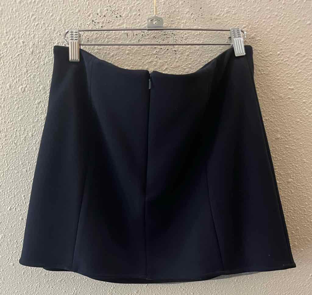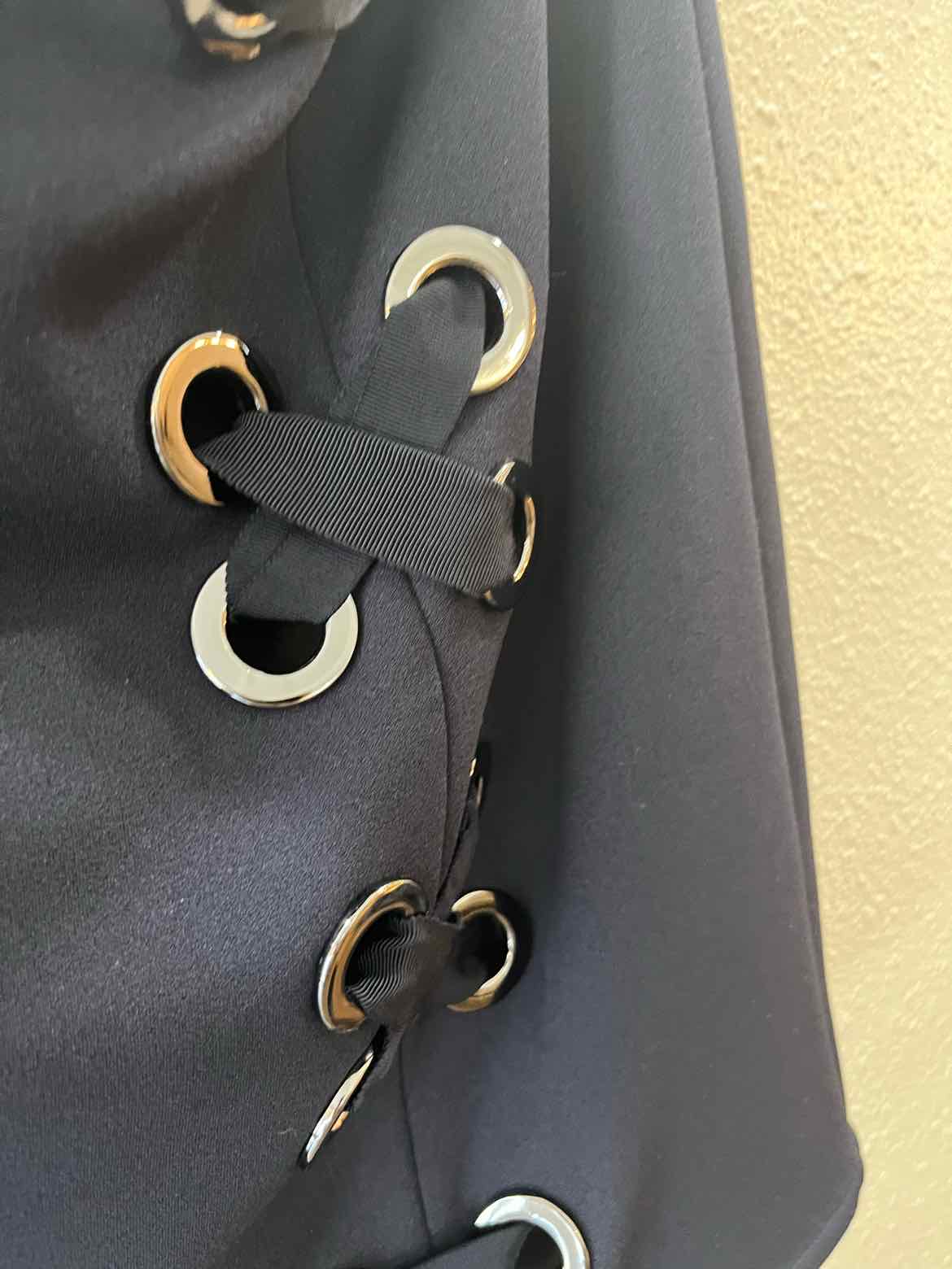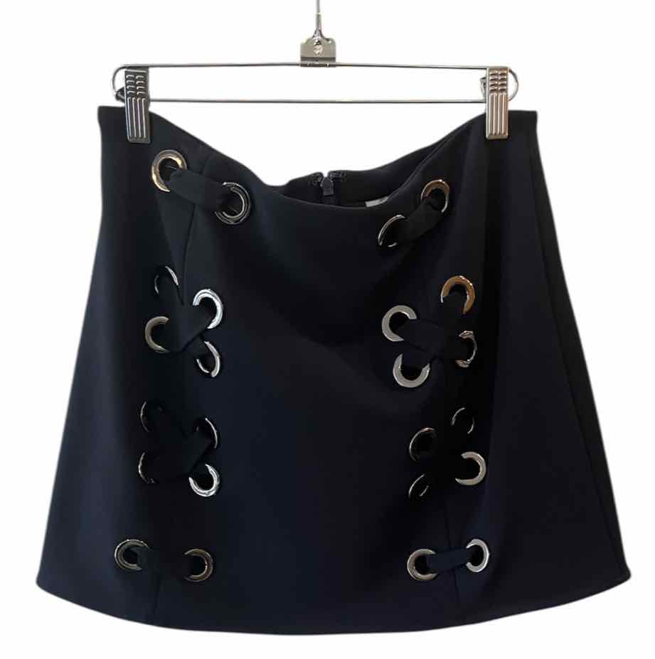 The color and unique design elements of this Prose & Poetry Navy Size M Skirt bring distinctive character to authentic luxury resale. With its rich navy hue and eye-catching large polished gunmetal grommets, this pre-loved designer mini skirt is a special addition to any women's consignment fashion collection. The crisscrossed fabric detail woven through the grommets infuses texture and artistry, while the mid to high rise fit and back zip offer polished styling and comfort. In excellent condition, this skirt reflects the elevated curation of pre-owned fashion, ready to seamlessly complement your wardrobe with a refined touch.