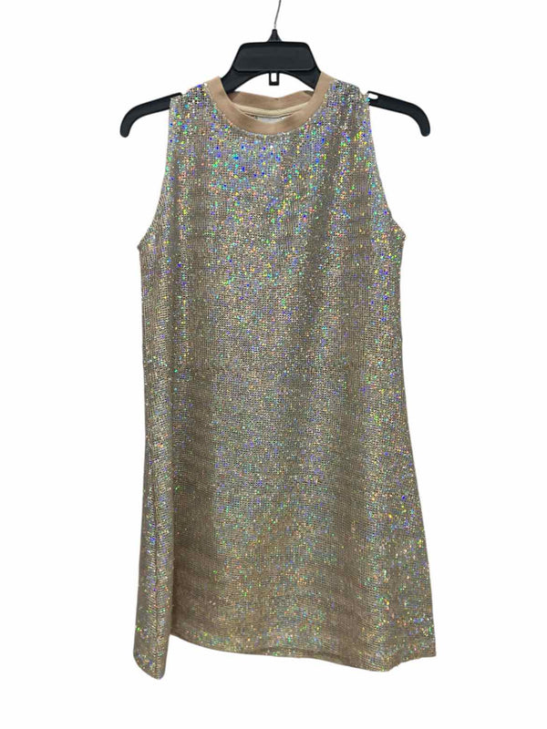 sleeveless, iridescent sequin mini dress, sheer, shift style, round neck with tan lining, gold shimmer,