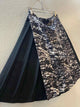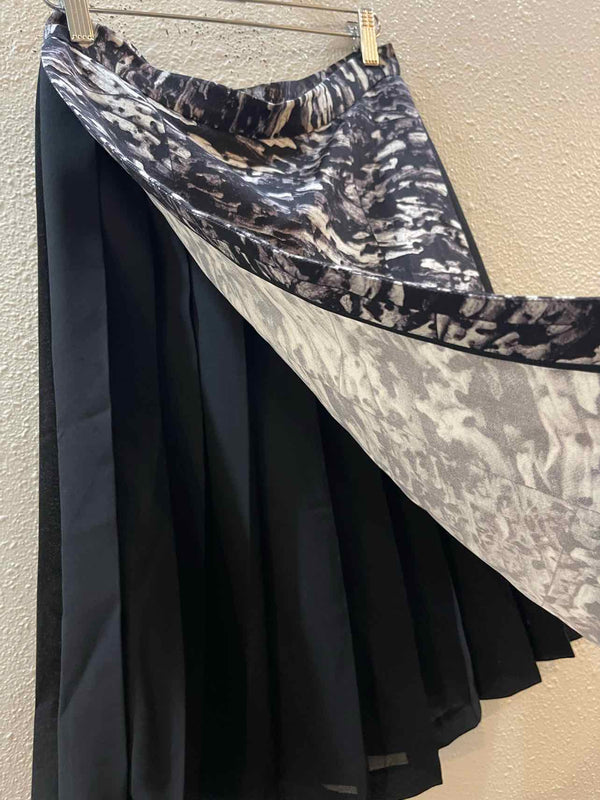 NWT, high rise, above knee, black multi, abstract print, semi sheer pleated A line skirt, side zip closure, fabric overlay, sheer pleated skirt bodice.