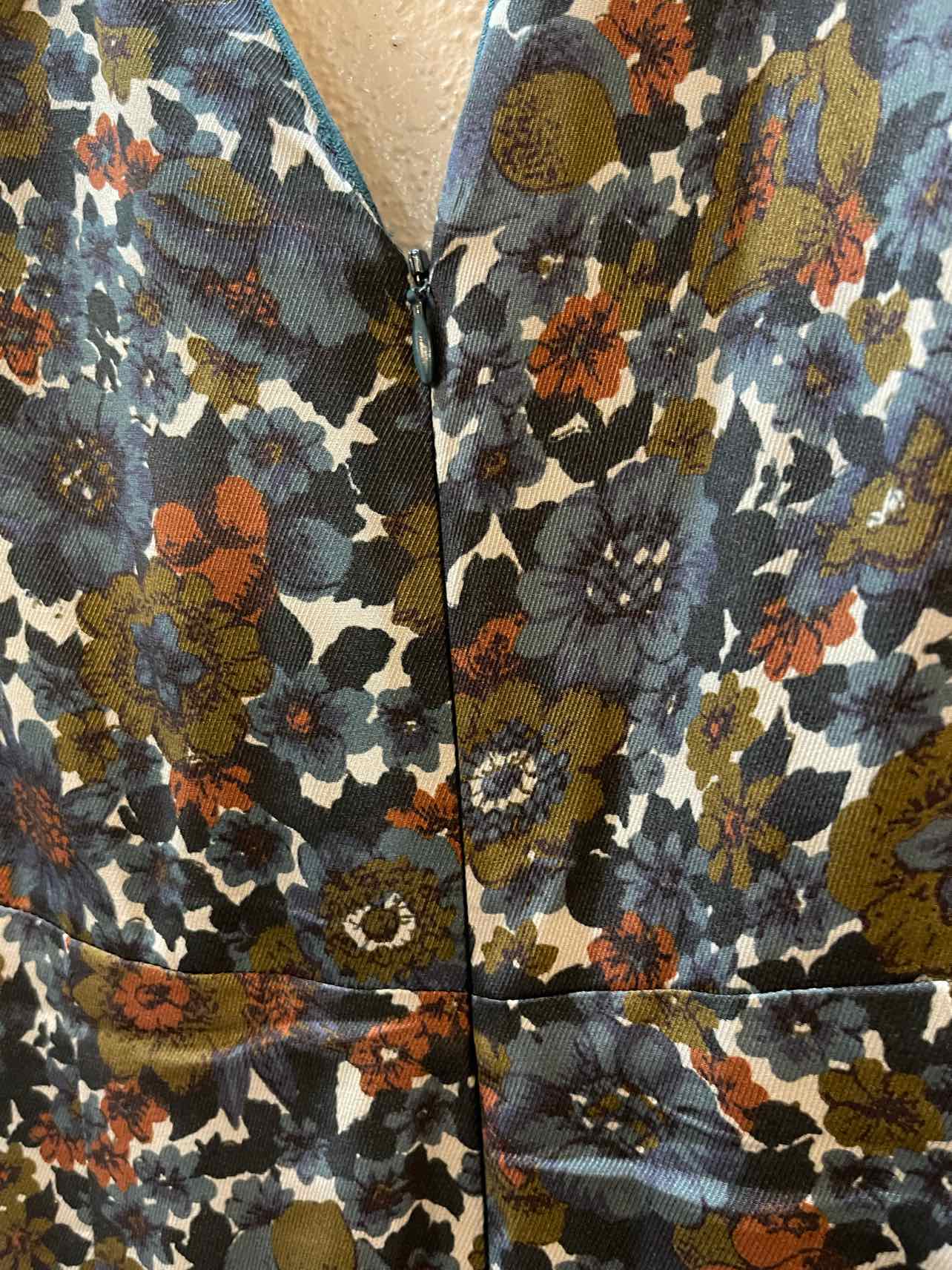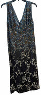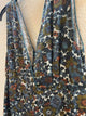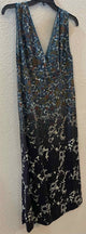 sleeveless, v-neck below knee, blue multi, floral and abstract design, Calvado dress, back zip closure, side slits hem,